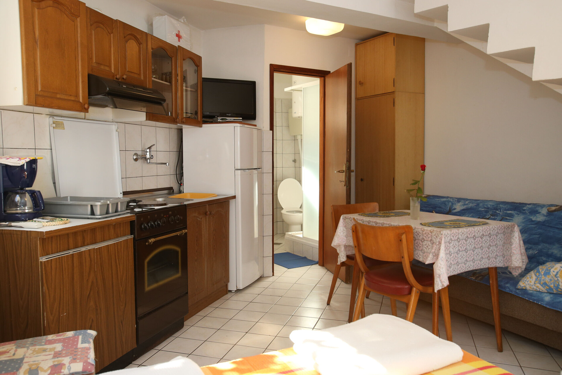 • table and chairs, kitchen sink, refrigerator, upright freezer, electric kettle, filter coffee machine, toaster, stove cooktop.