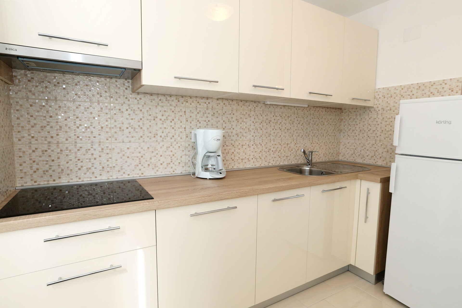 • table and chairs, kitchen sink, refrigerator, electric kettle, filter coffee machine, stove cooktop.