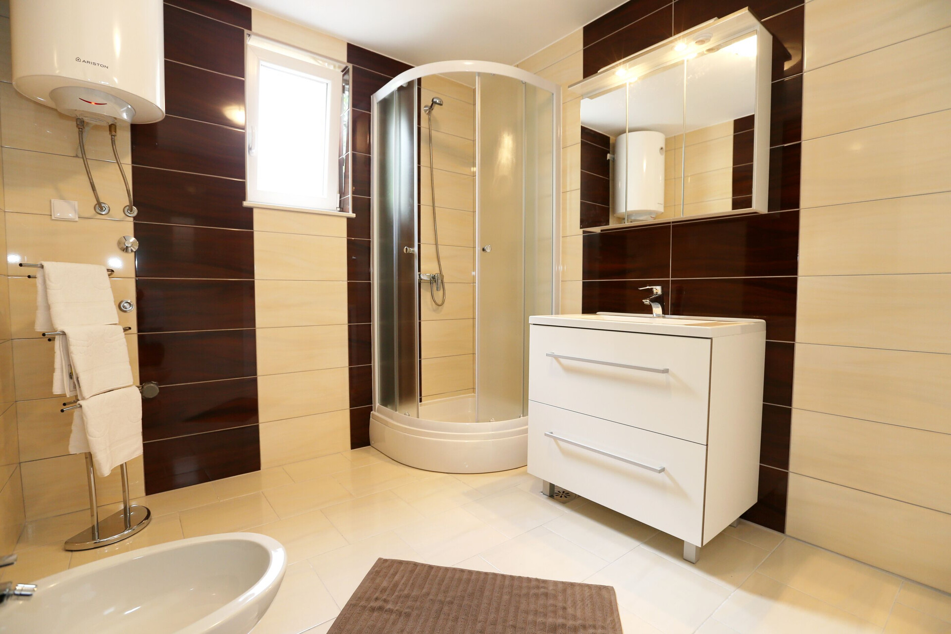 • shower, shower enclosure, towels.