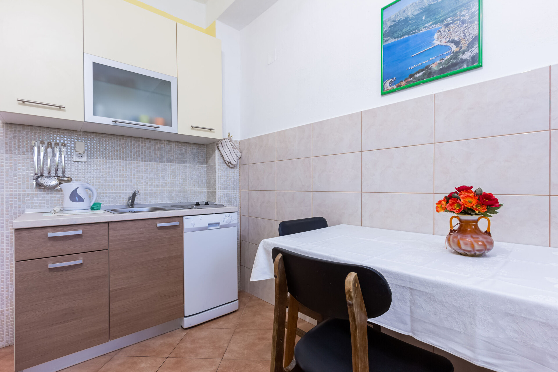 • table and chairs, kitchen sink, refrigerator, upright freezer, electric kettle, filter coffee machine, microwave oven, dishwasher, stove cooktop.