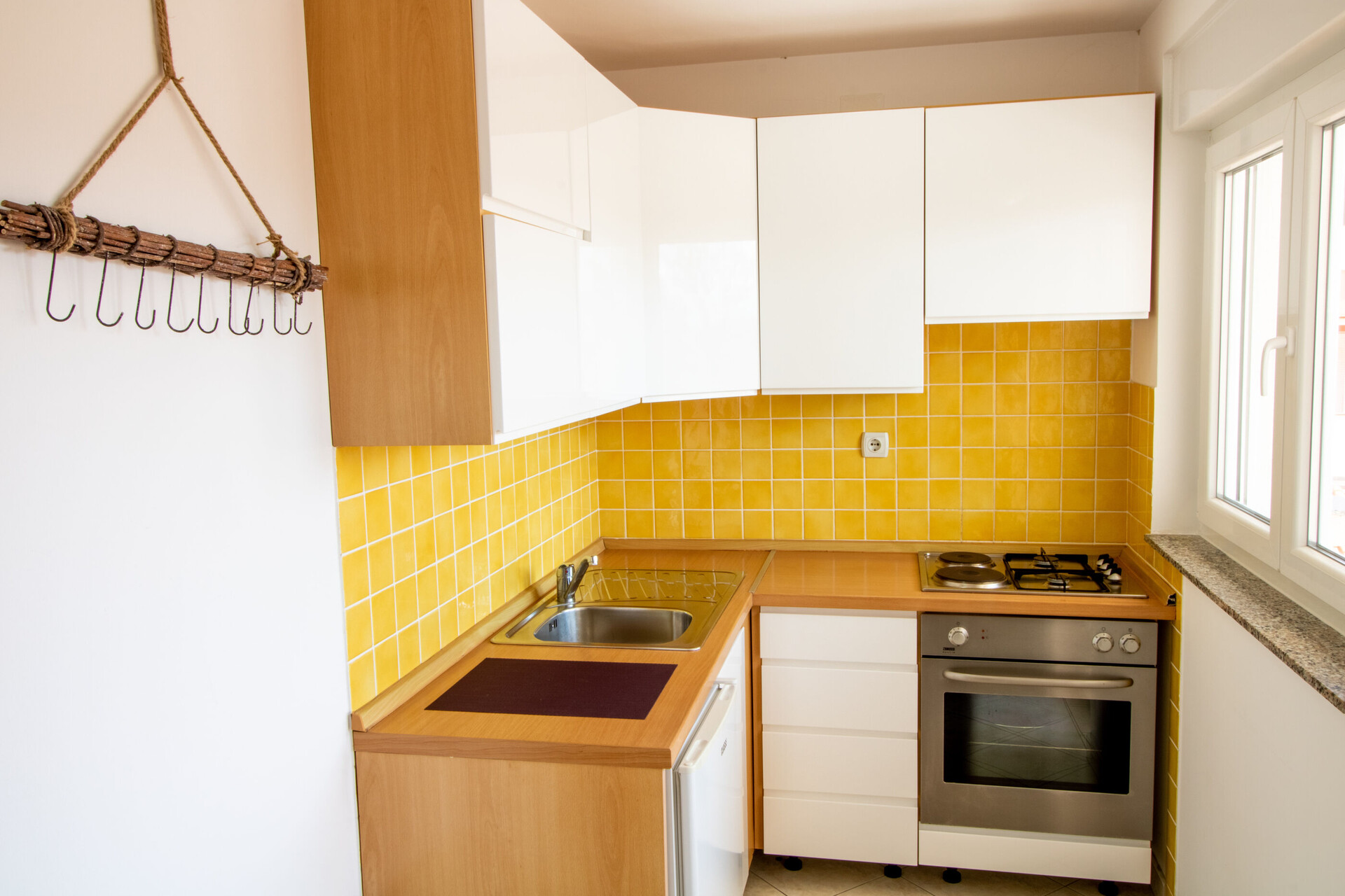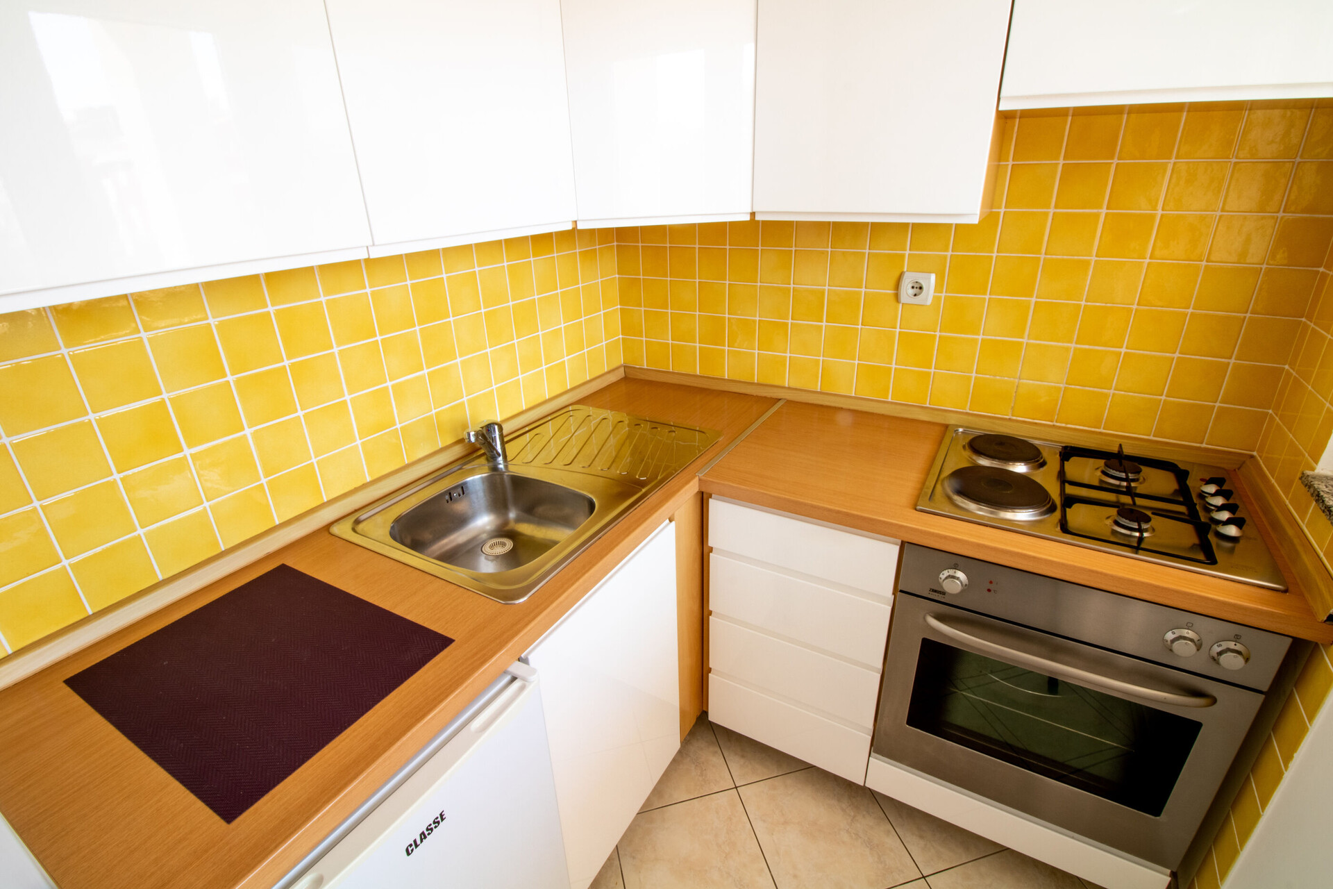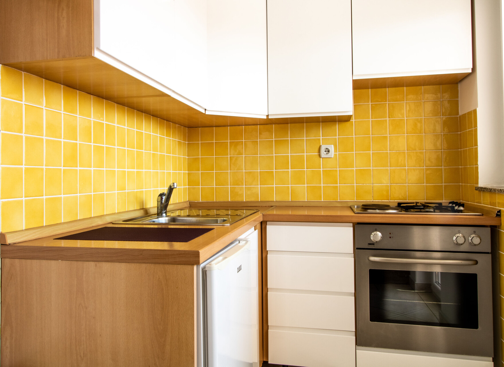 • table and chairs, kitchen sink, oven, refrigerator, upright freezer, electric kettle, filter coffee machine, toaster, iron, stove cooktop.