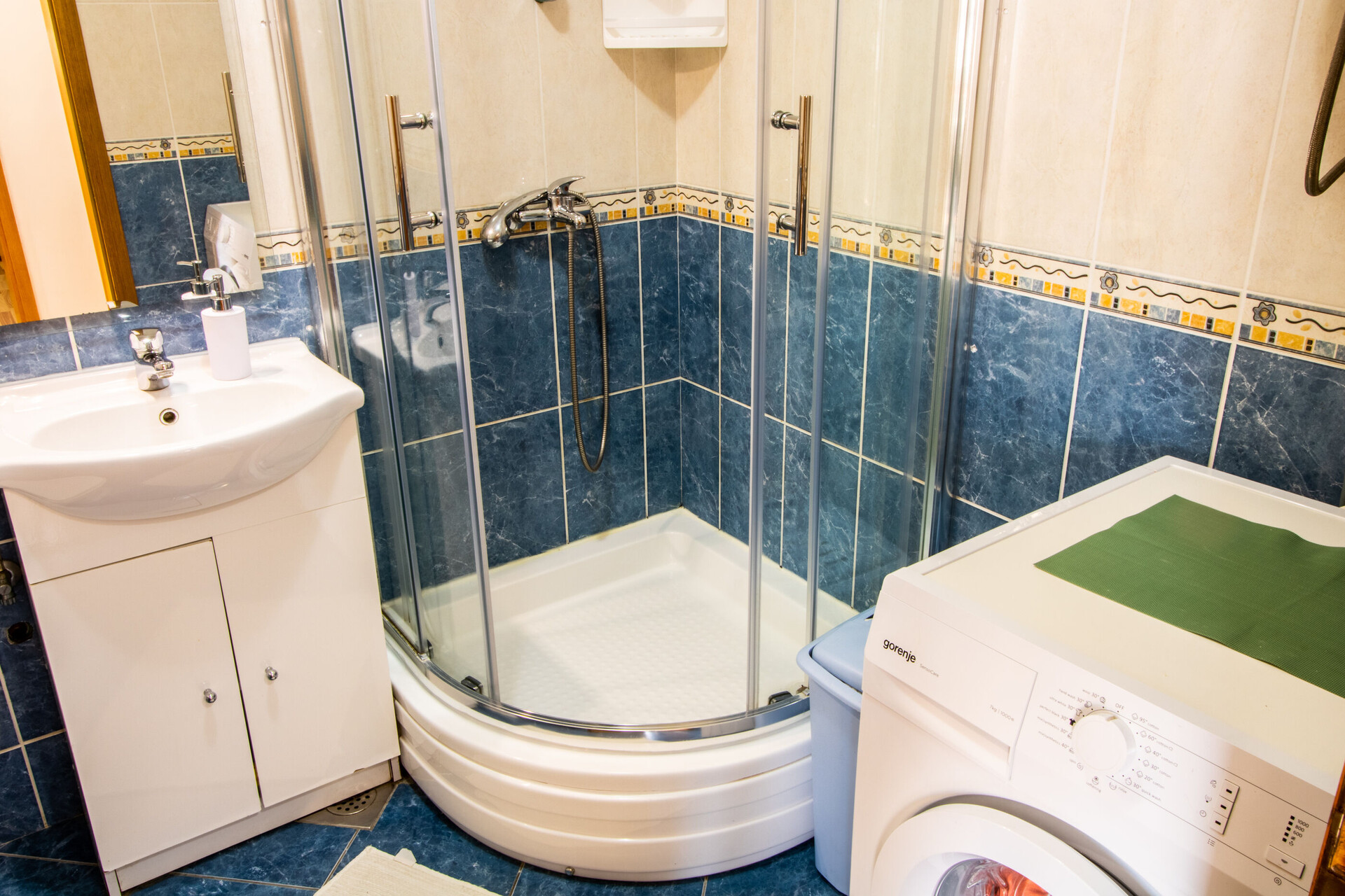• shower, shower enclosure, washing machine, hairdryer, towels.