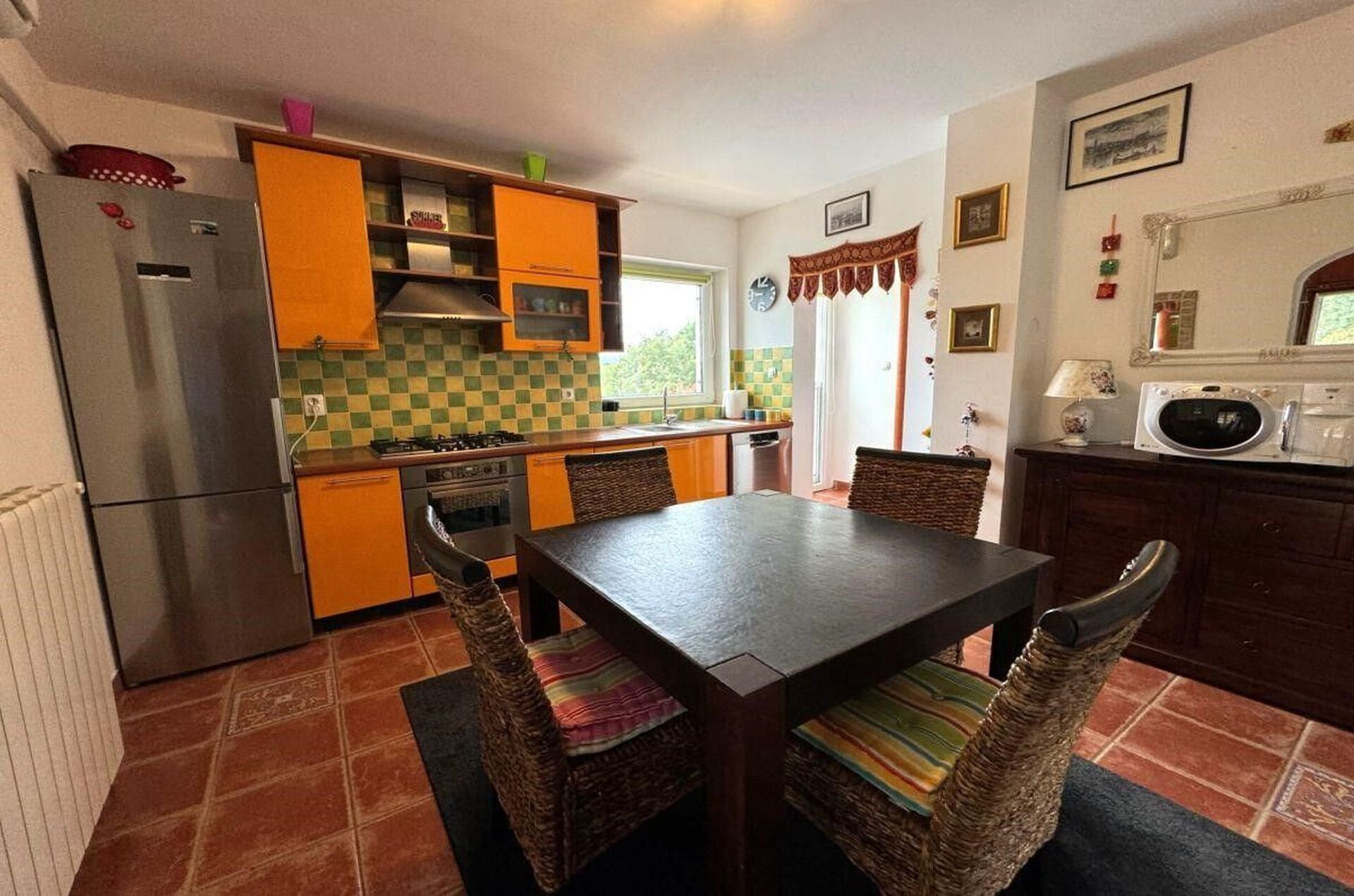 • table and chairs, kitchen sink, oven, refrigerator, upright freezer, electric kettle, filter coffee machine, microwave oven, toaster, dishwasher, iron, stove cooktop.