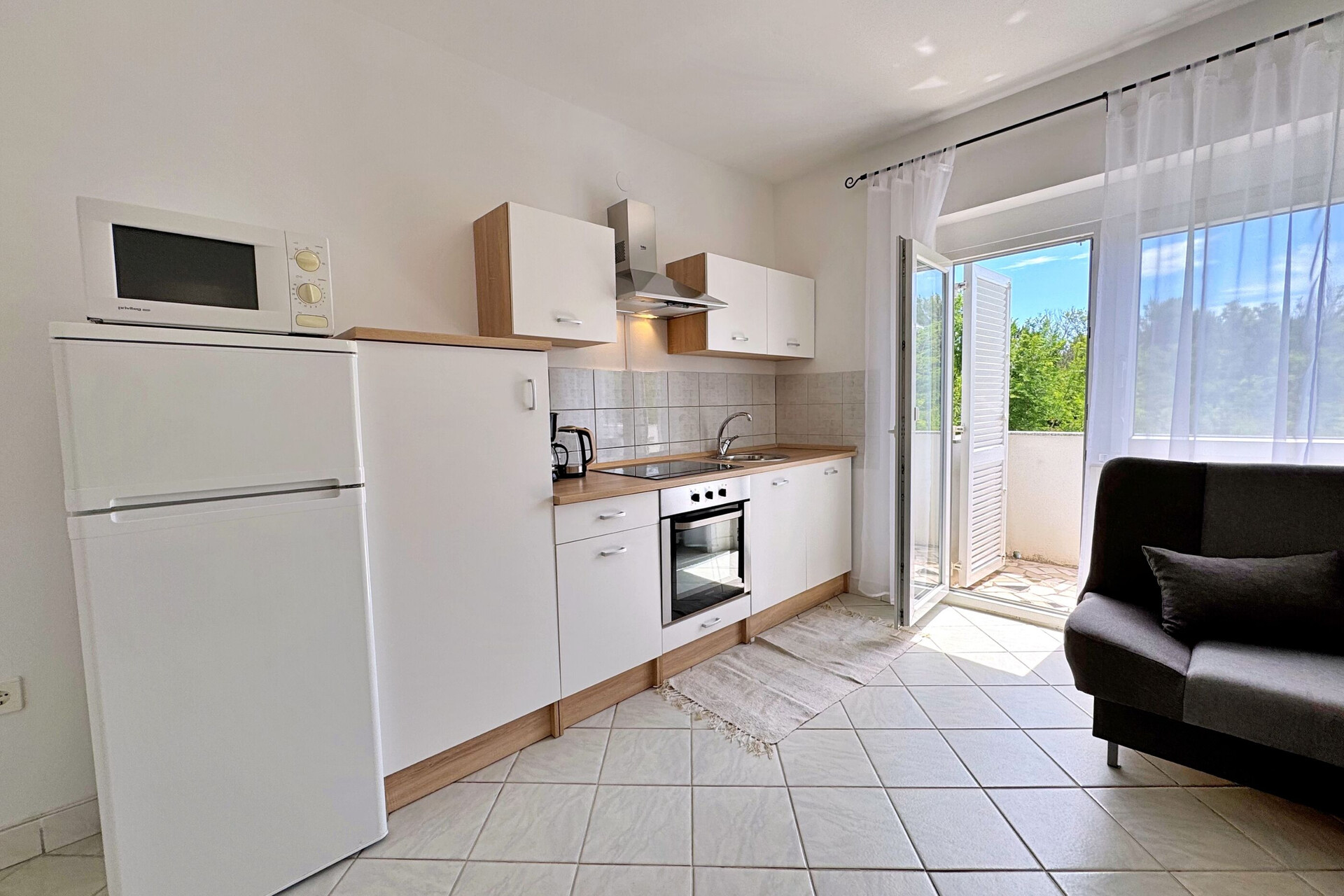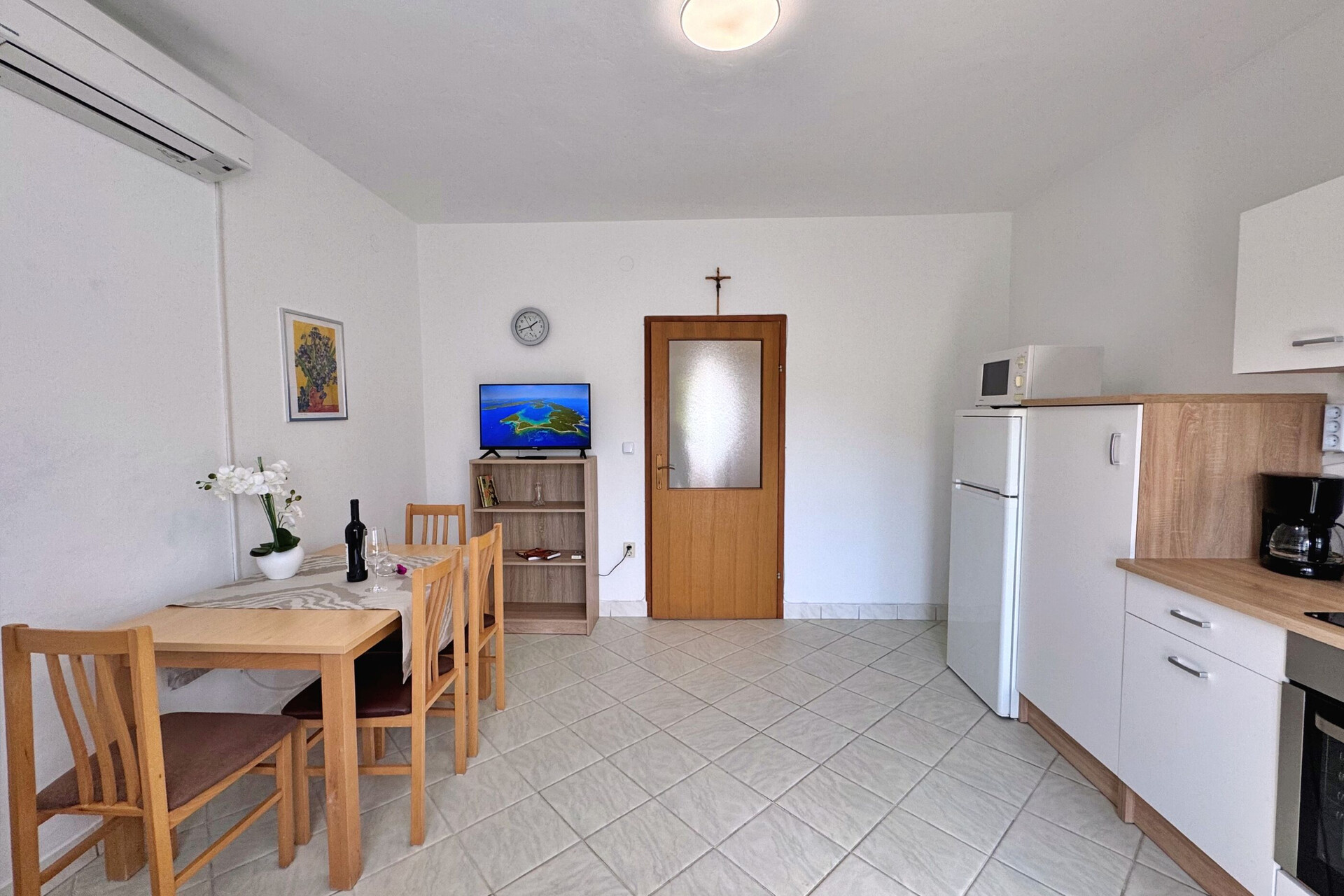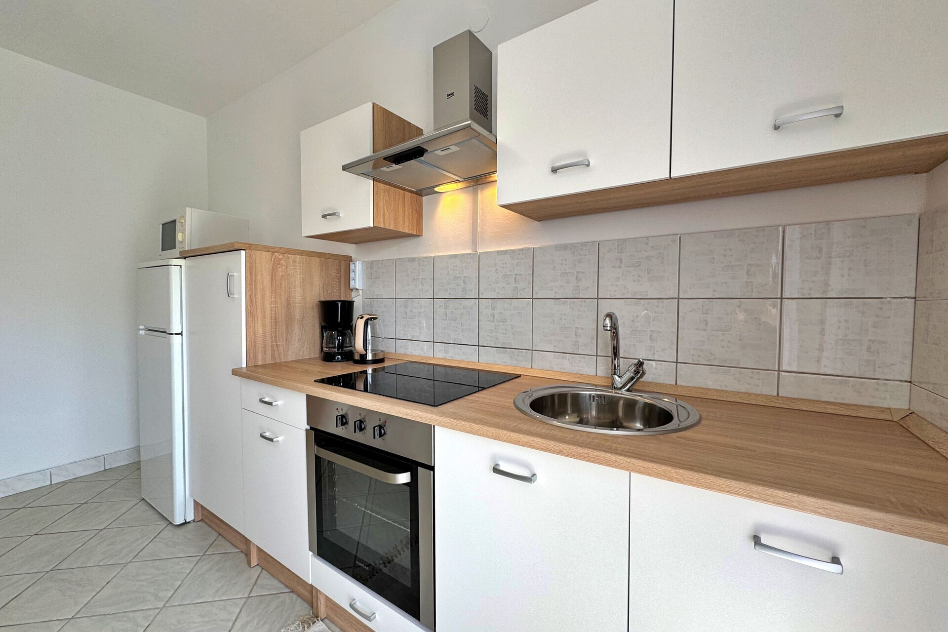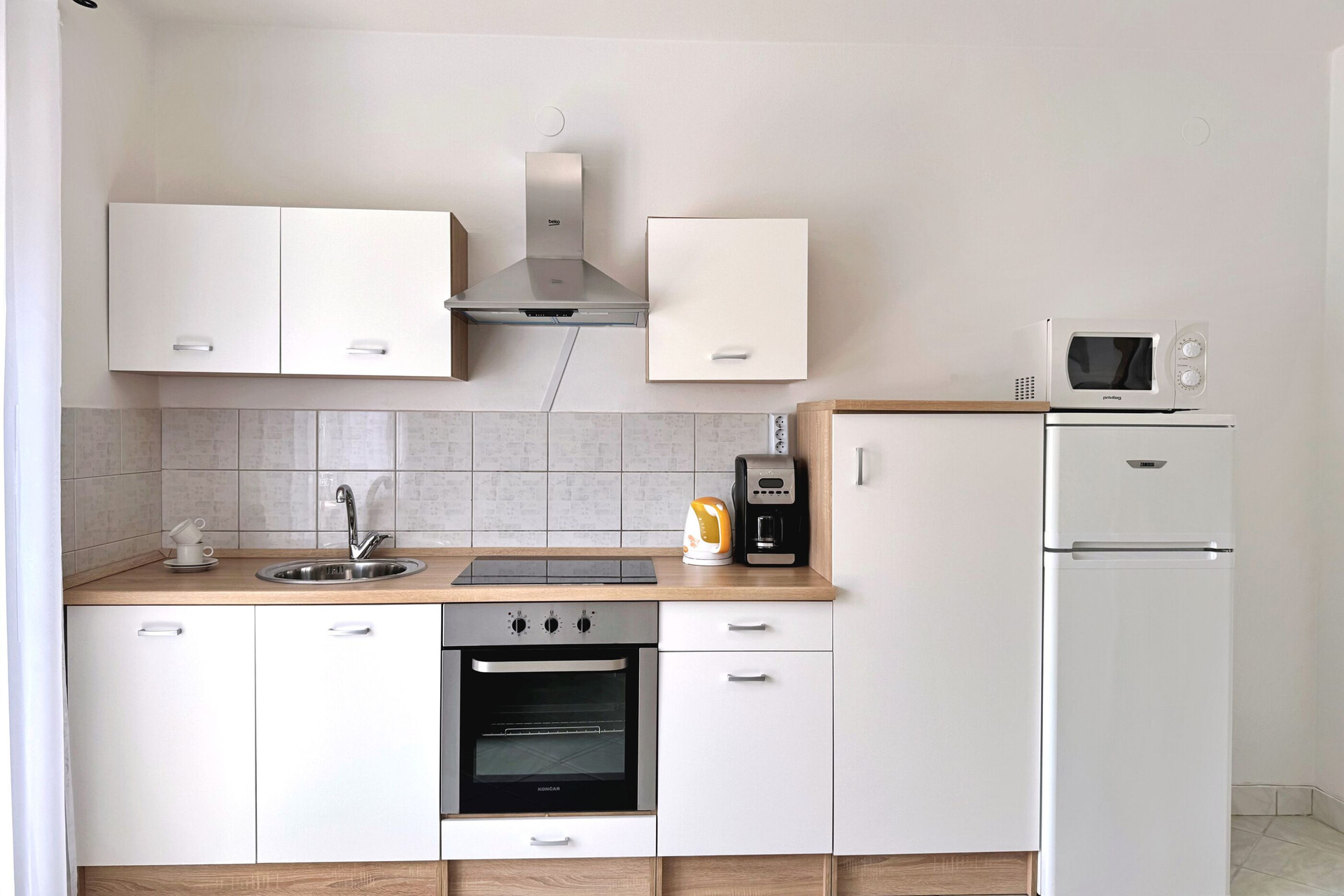 • table and chairs, kitchen sink, oven, refrigerator, upright freezer, electric kettle, filter coffee machine, microwave oven, toaster, iron, stove cooktop.