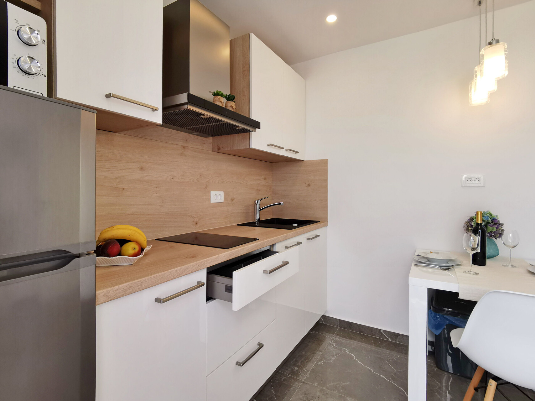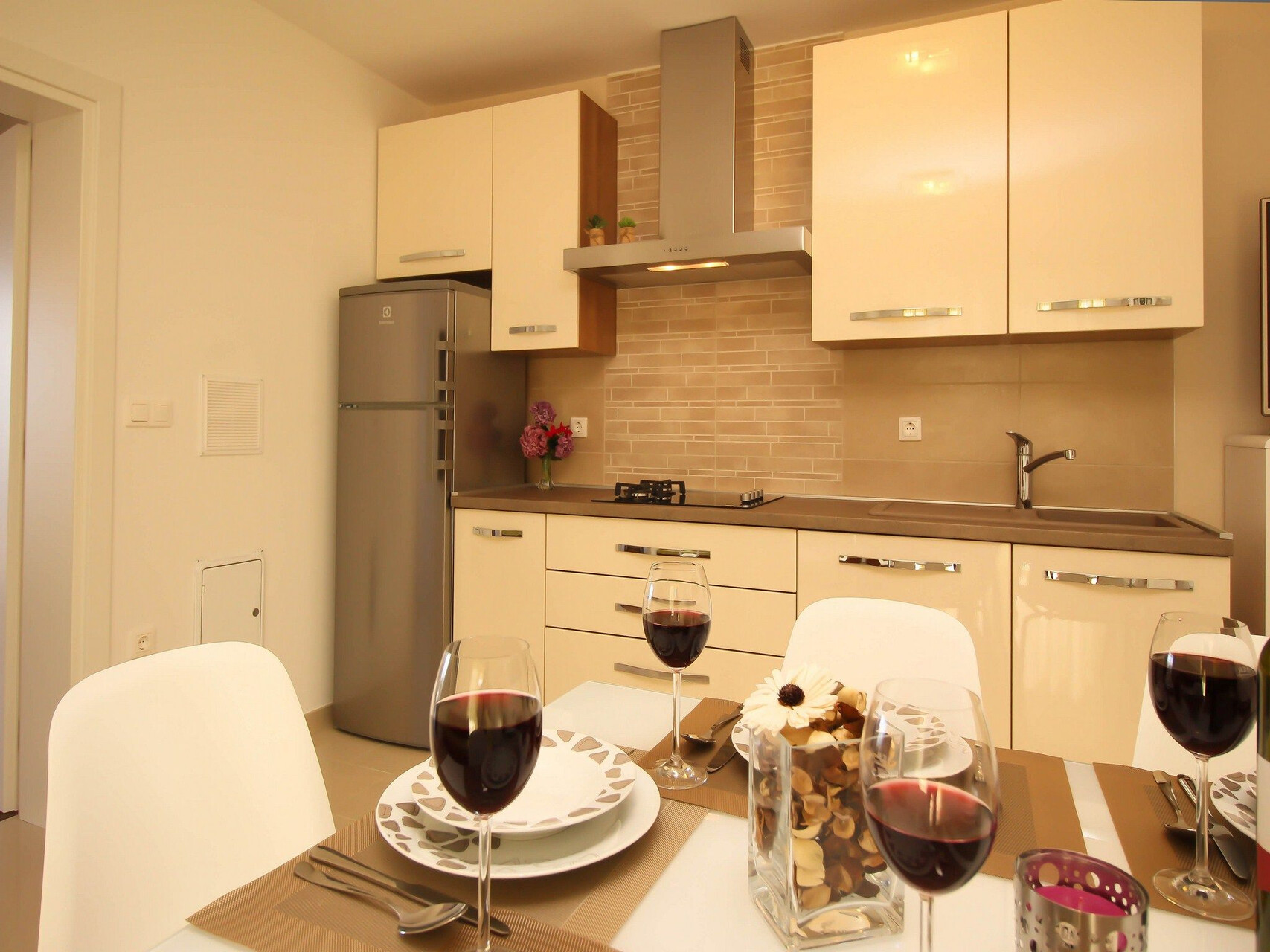 • table and chairs, kitchen sink, refrigerator, upright freezer, electric kettle, filter coffee machine, microwave oven, dishwasher, iron, stove cooktop.