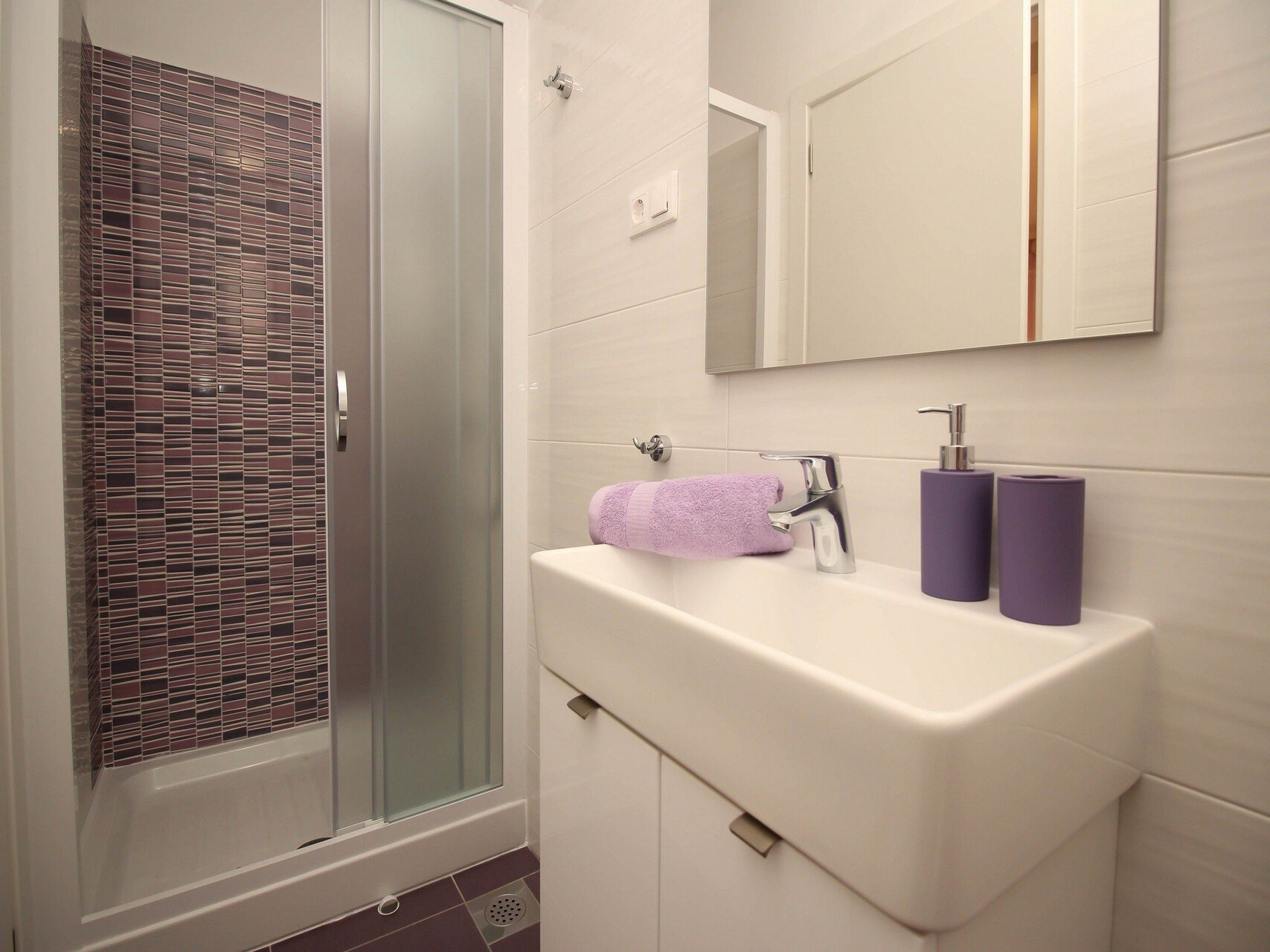 • shower, shower enclosure, towels.