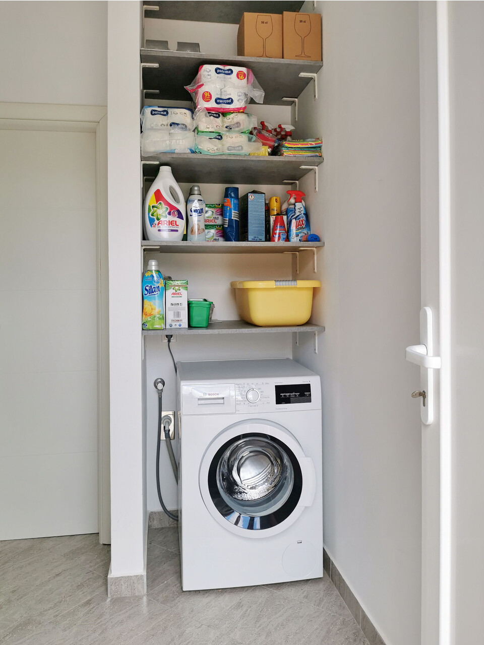 • shower, shower enclosure, washing machine, hairdryer, towels.