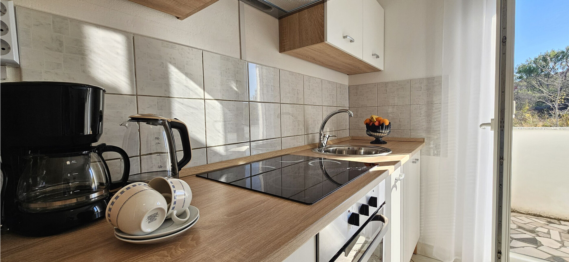 • table and chairs, kitchen sink, oven, refrigerator, upright freezer, electric kettle, filter coffee machine, stove cooktop.