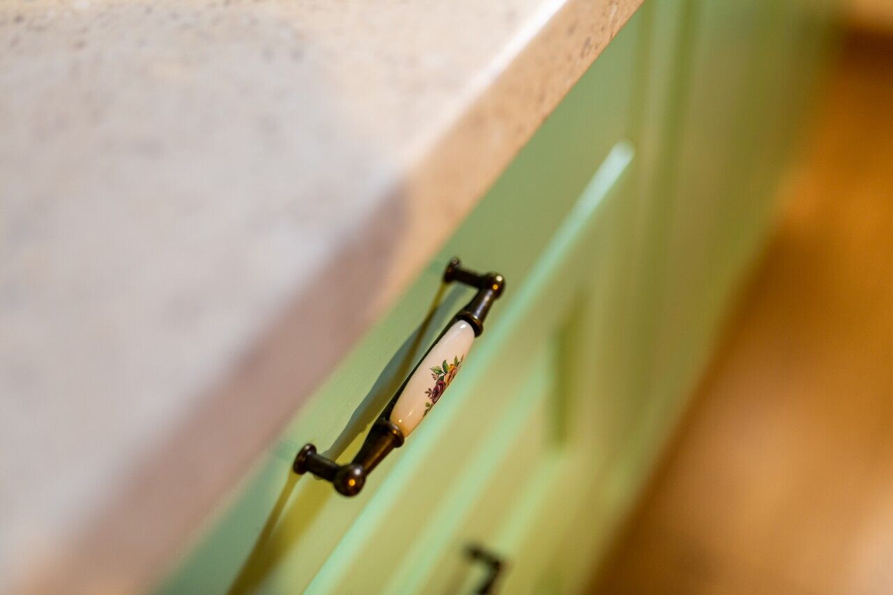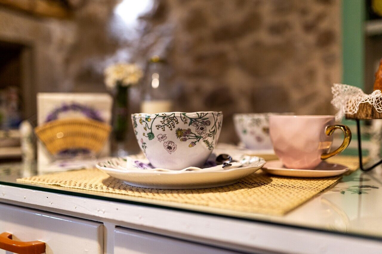 • table and chairs, kitchen sink, refrigerator, upright freezer, electric kettle, filter coffee machine, stove cooktop.