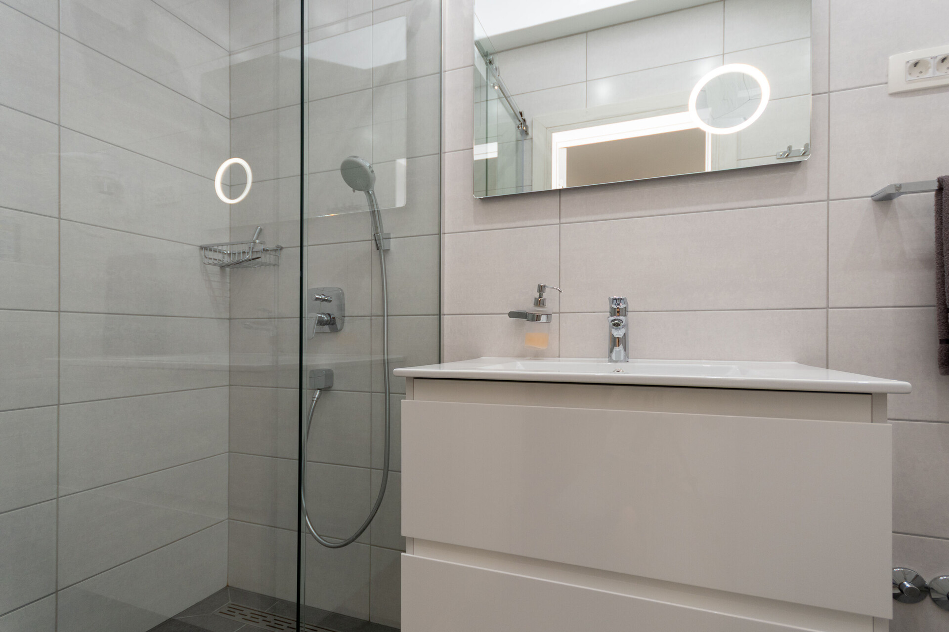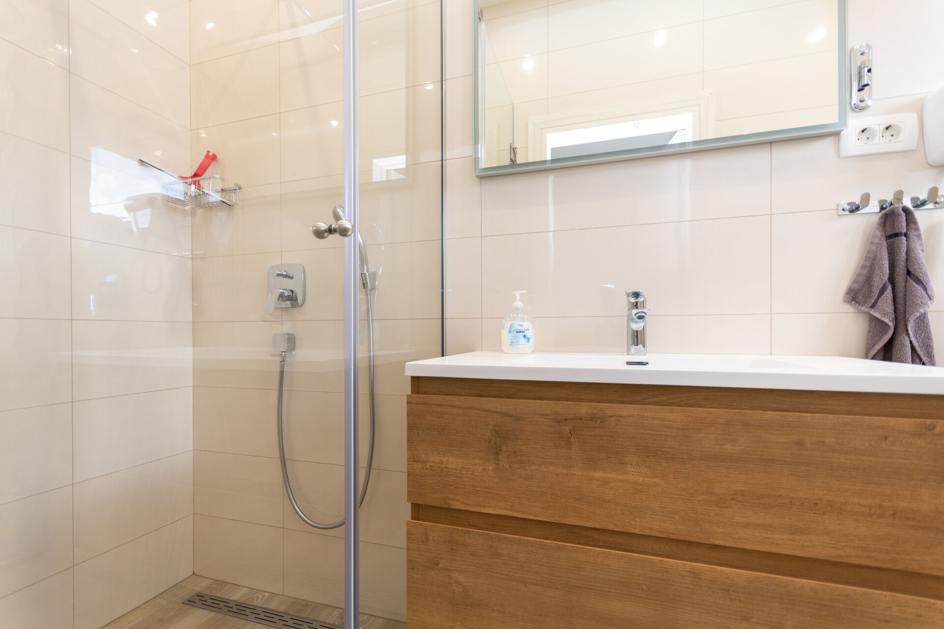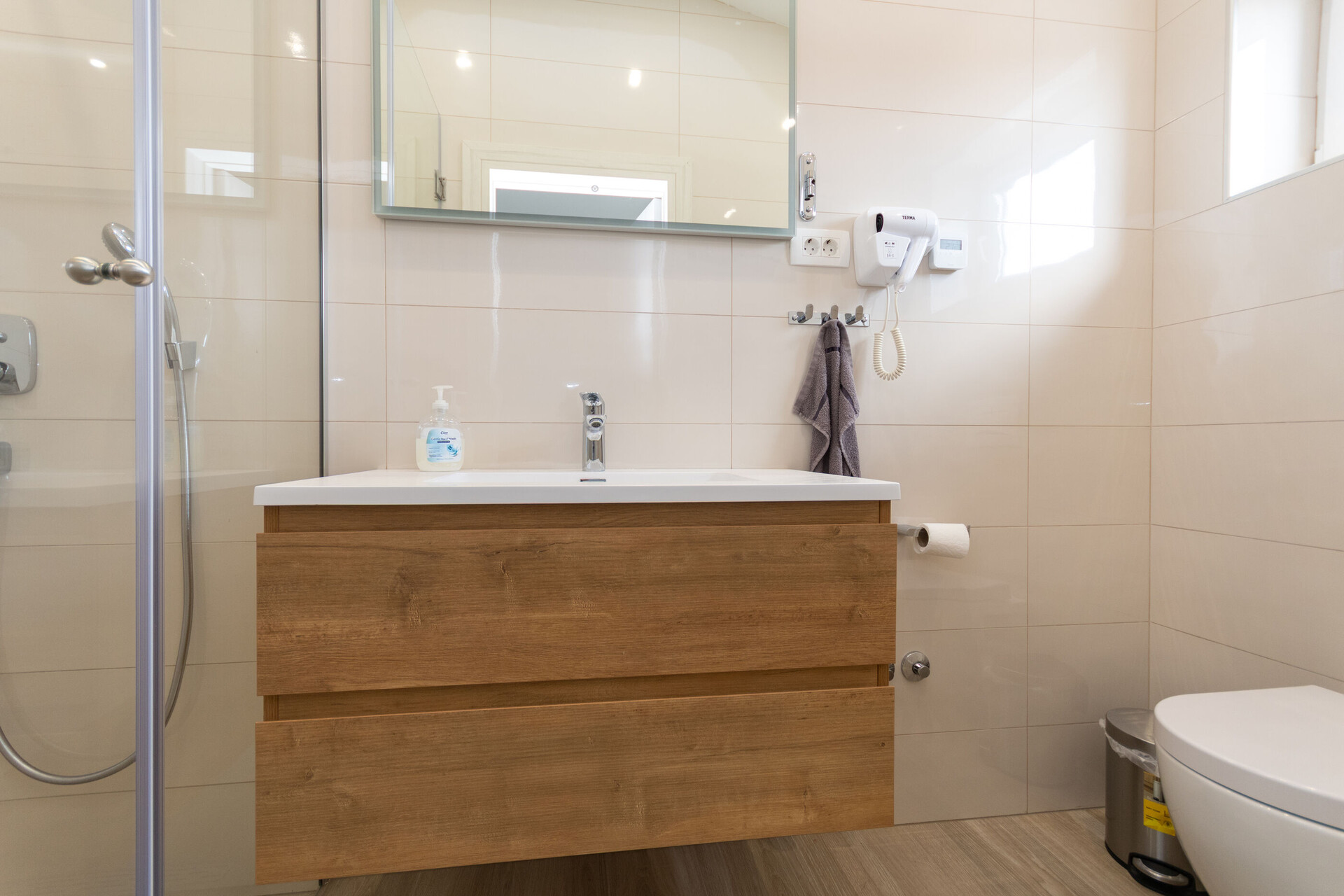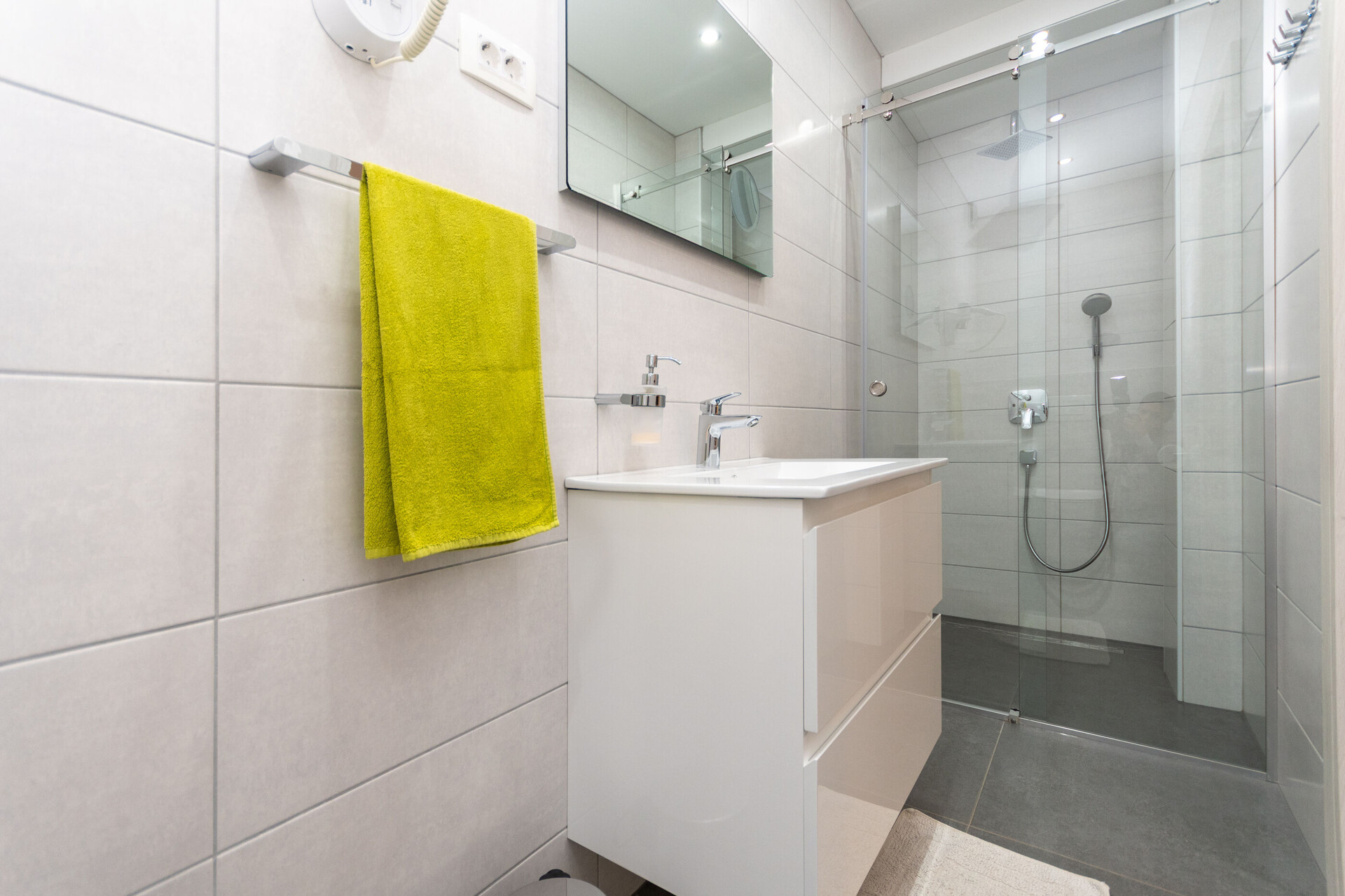 • shower, shower enclosure, washing machine, hairdryer, towels.