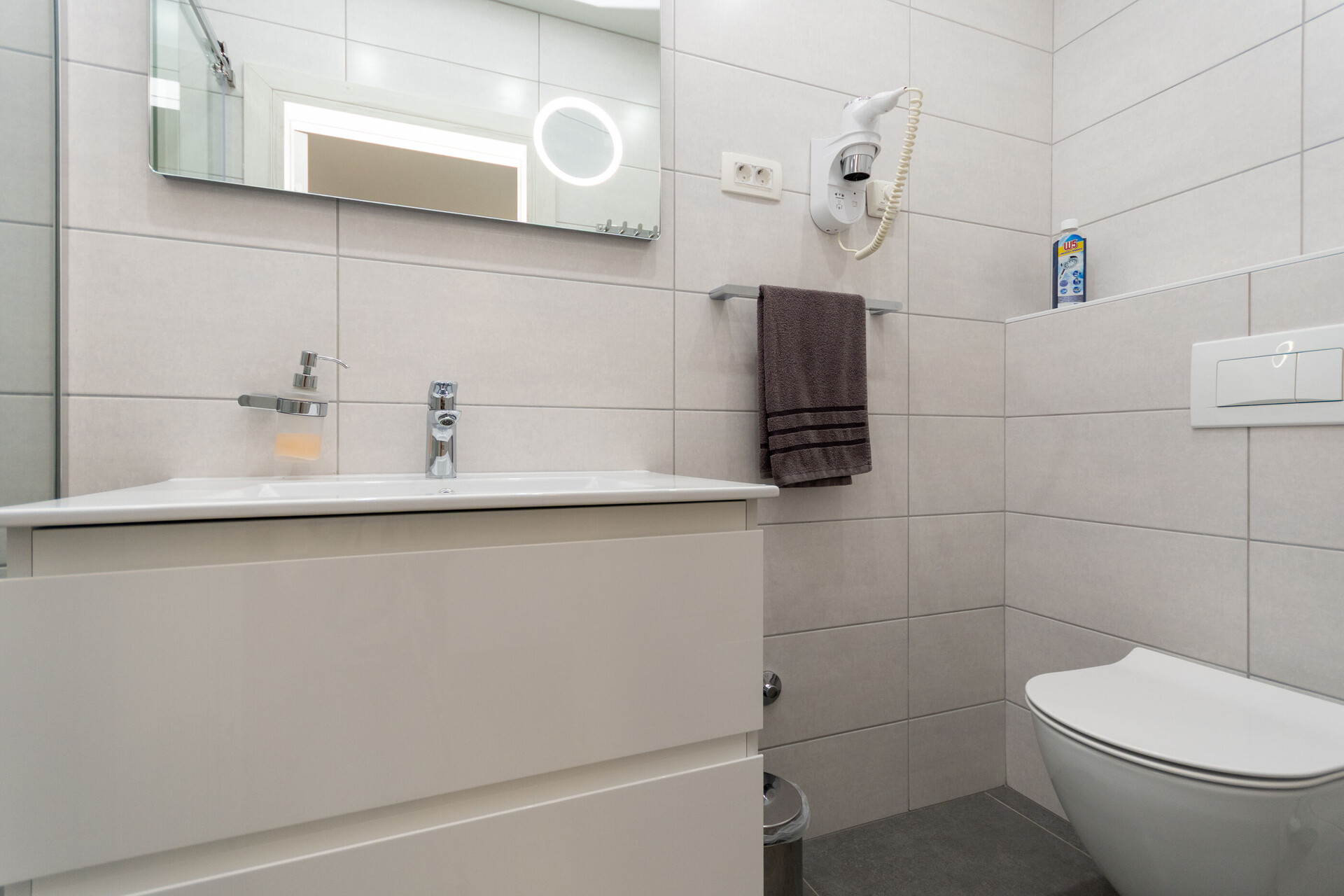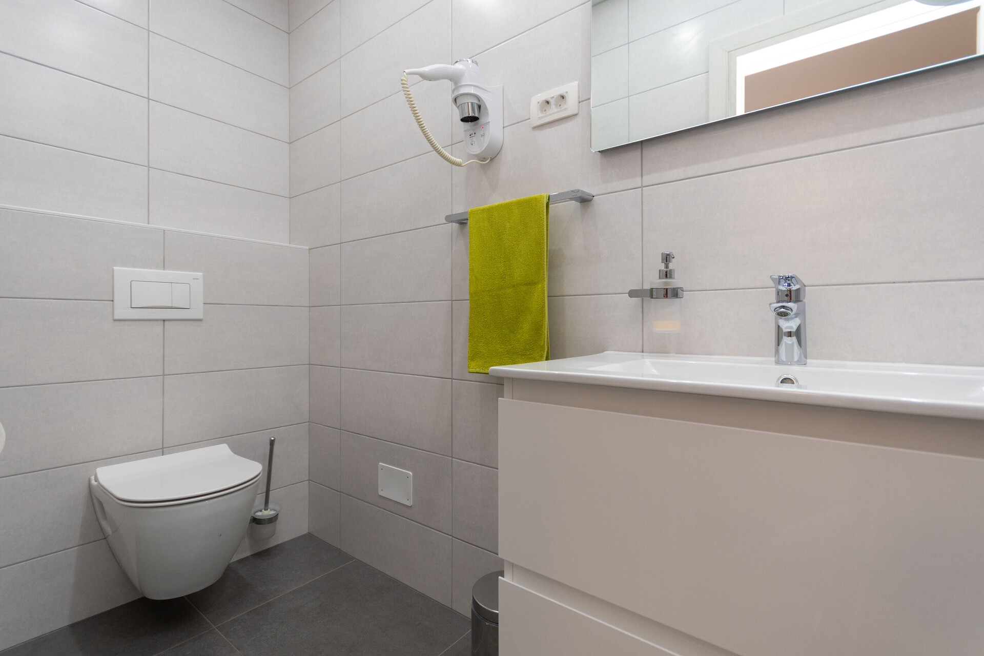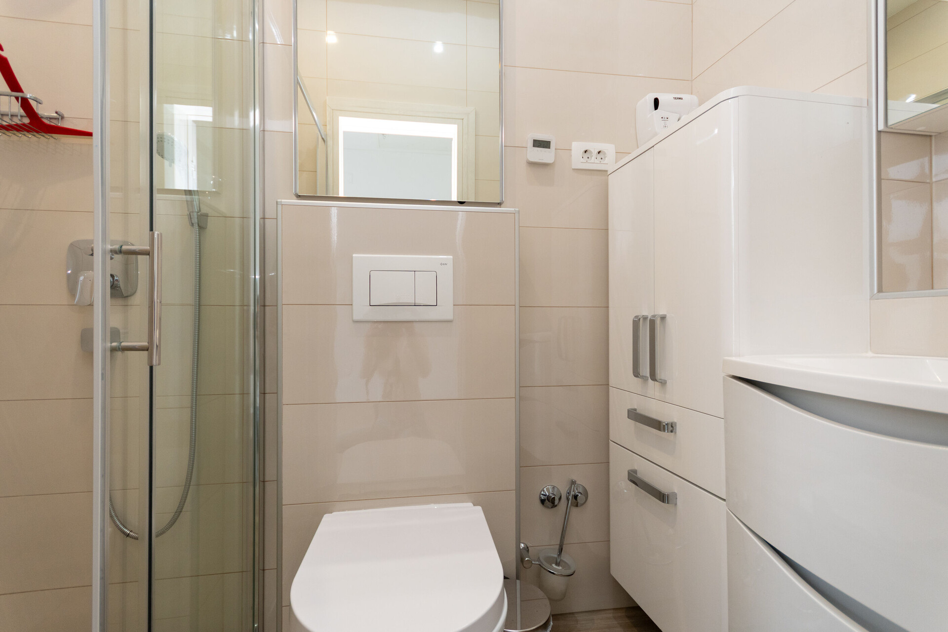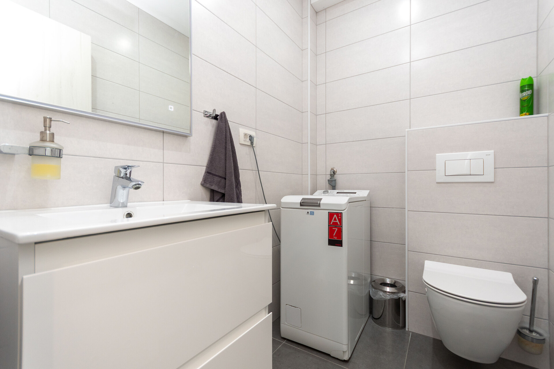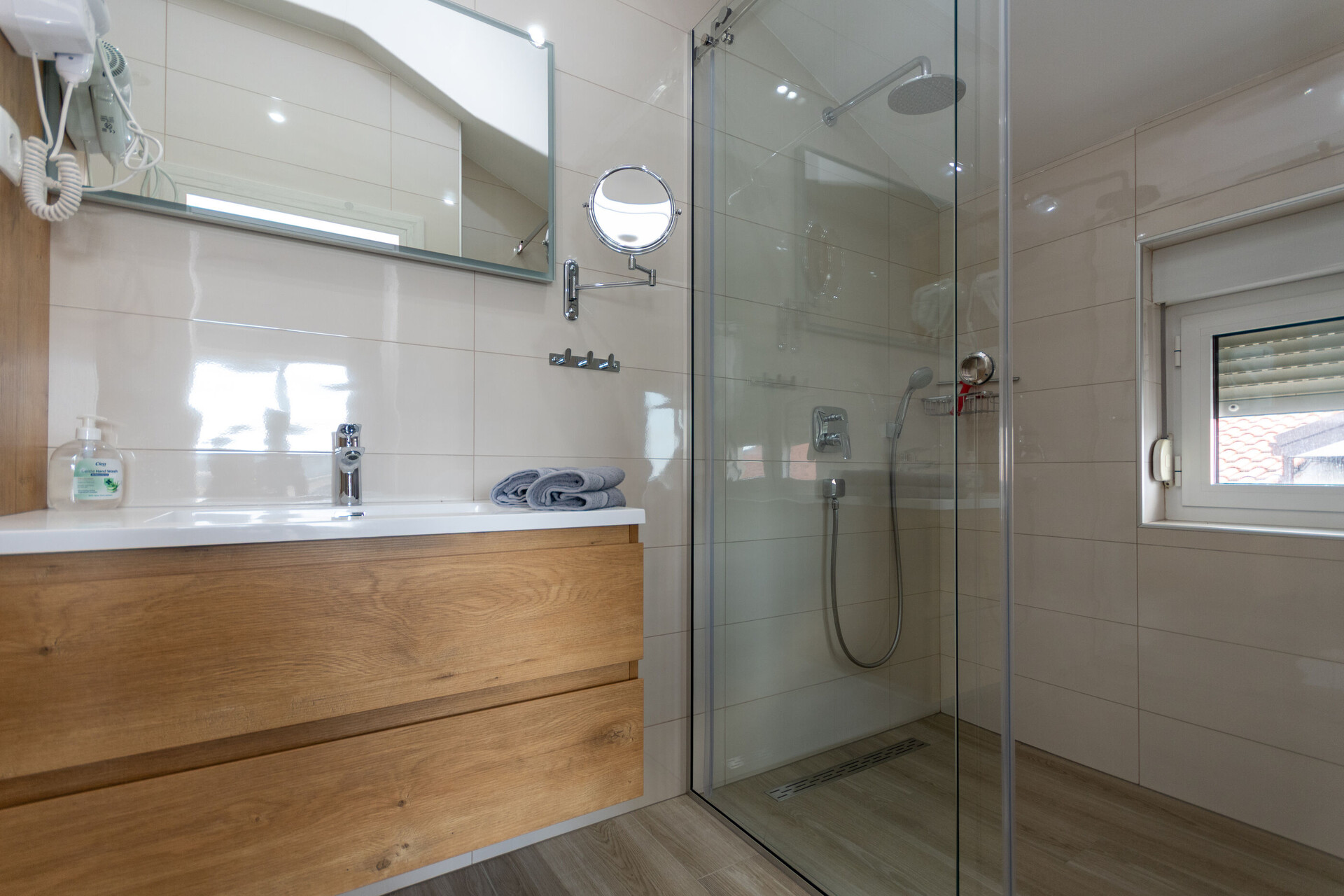• shower, shower enclosure, washing machine, hairdryer, towels.