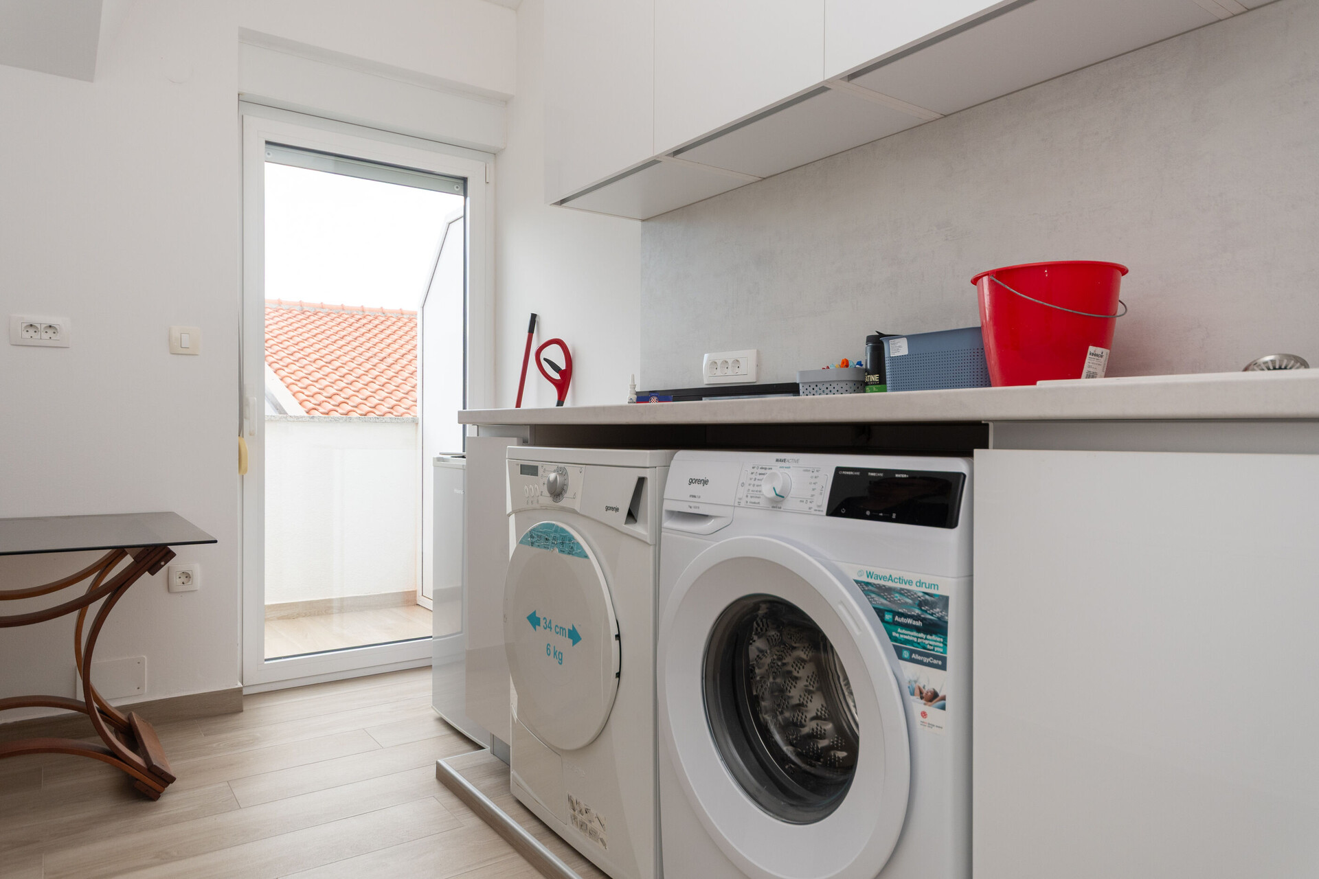 • table and chairs, kitchen sink, oven, refrigerator, upright freezer, electric kettle, filter coffee machine, microwave oven, dishwasher, iron, stove cooktop.