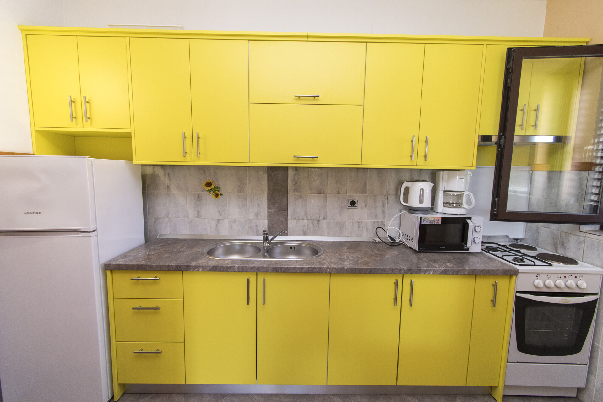 • table and chairs, kitchen sink, filter coffee machine, microwave oven, stove cooktop.