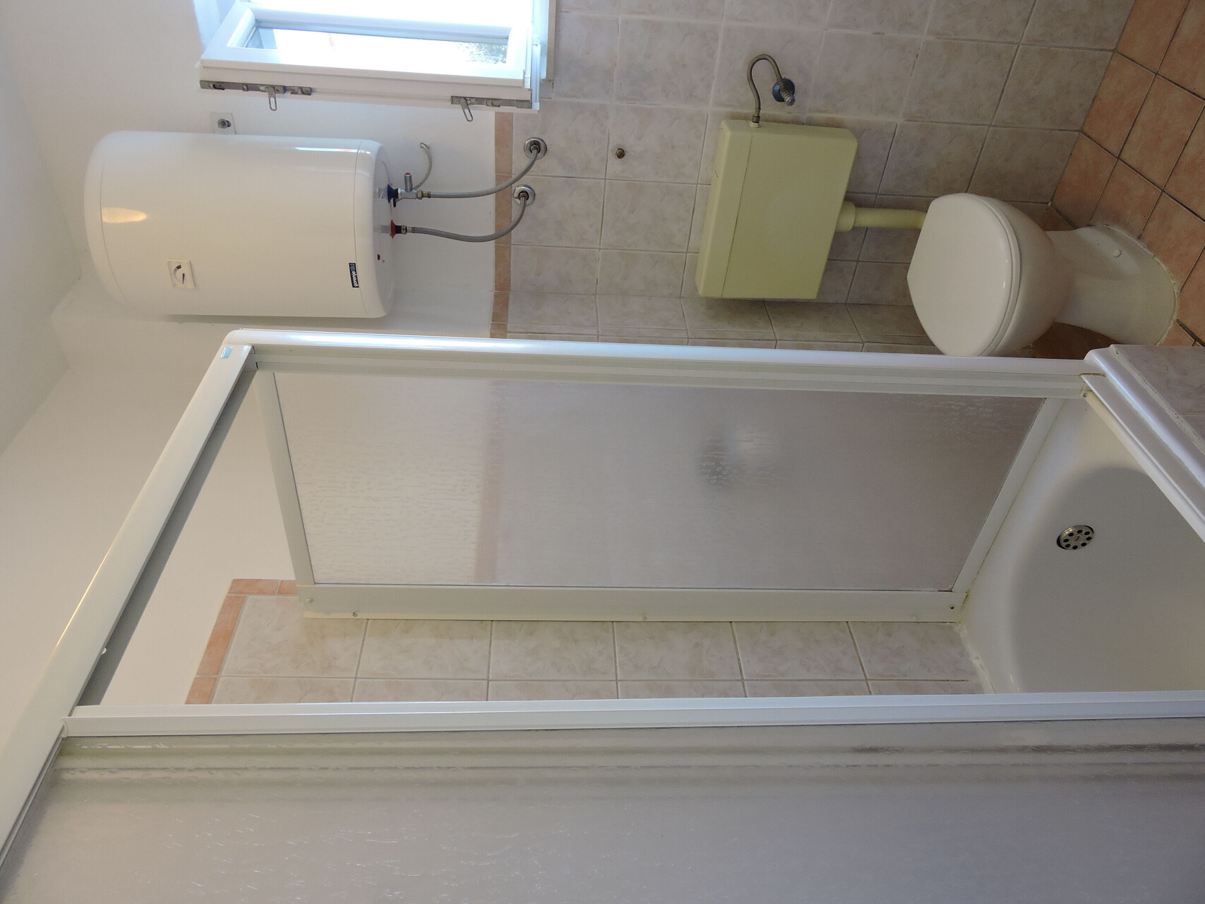 • shower, shower enclosure, washing machine, hairdryer, towels.