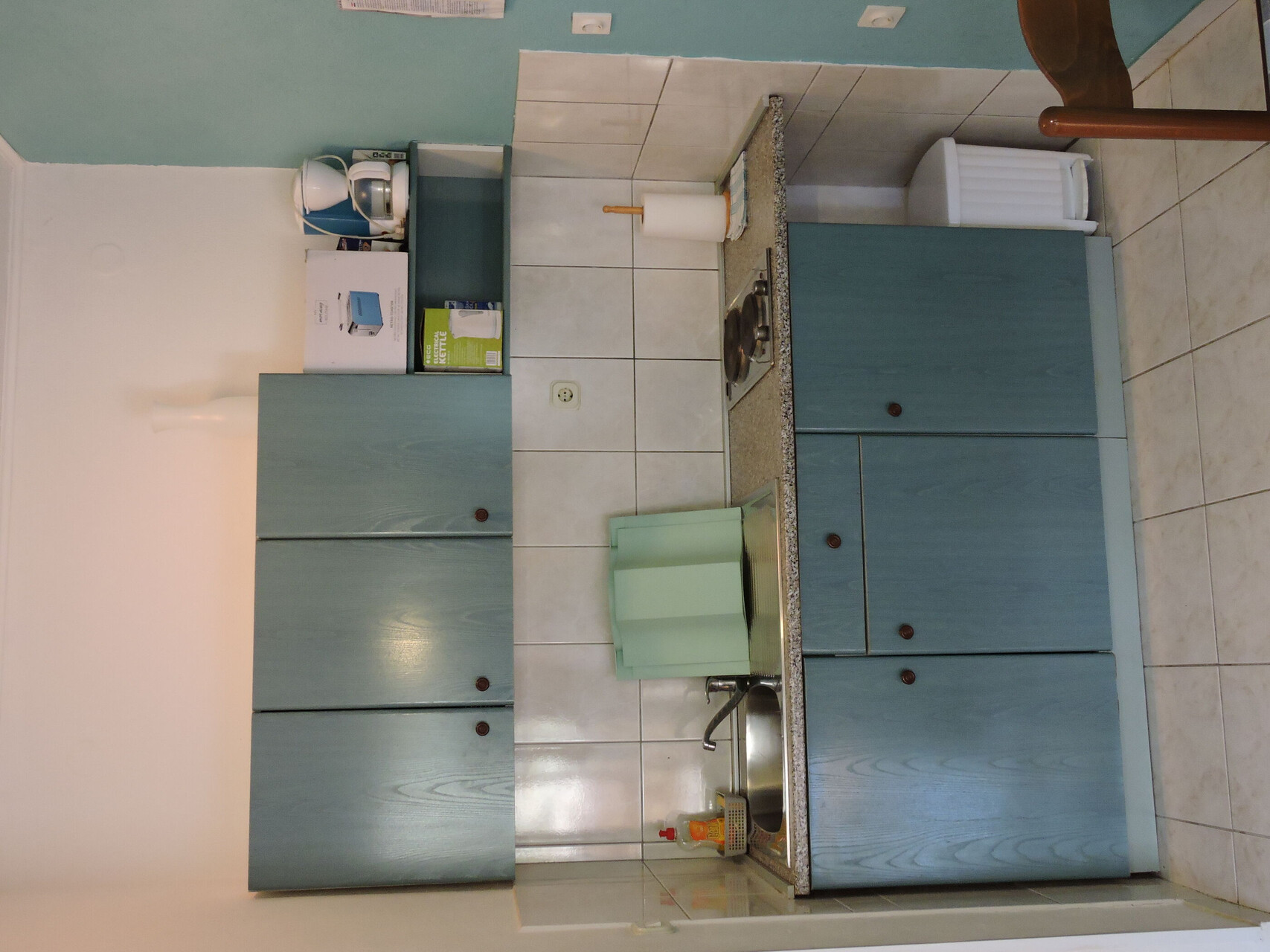 • table and chairs, kitchen sink, refrigerator, upright freezer, electric kettle, filter coffee machine, toaster, iron, stove cooktop.
