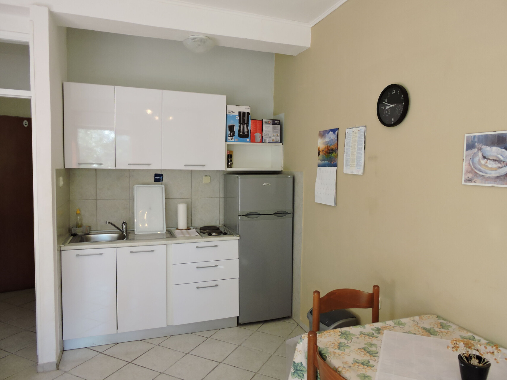 • table and chairs, kitchen sink, refrigerator, upright freezer, electric kettle, filter coffee machine, toaster, stove cooktop.