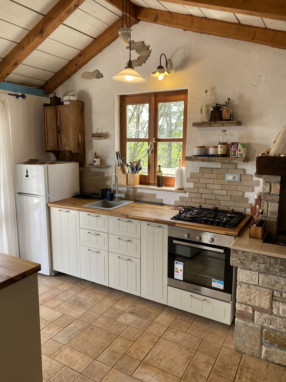 • table and chairs, kitchen sink, oven, refrigerator, upright freezer, electric kettle, filter coffee machine, toaster, dishwasher, stove cooktop.