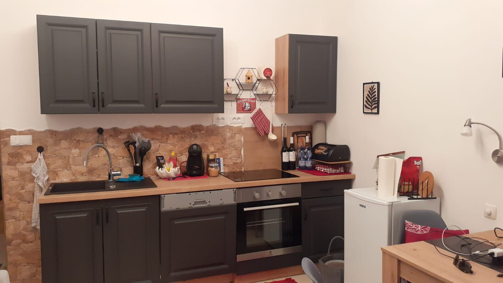 • table and chairs, kitchen sink, oven, refrigerator, upright freezer, electric kettle, filter coffee machine, toaster, dishwasher, iron, stove cooktop.