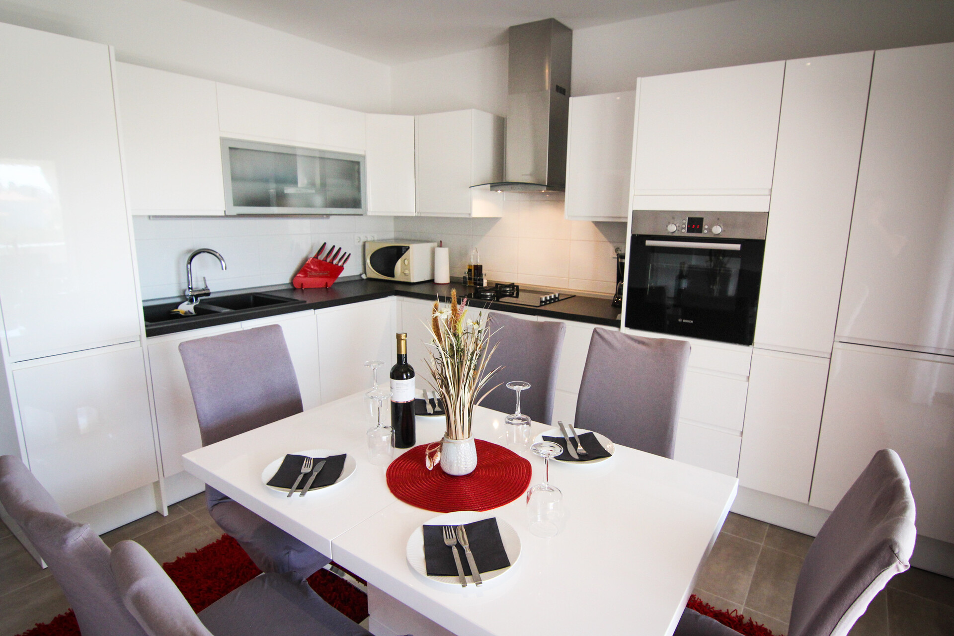 • table and chairs, kitchen sink, oven, refrigerator, upright freezer, electric kettle, filter coffee machine, microwave oven, dishwasher, iron, stove cooktop.