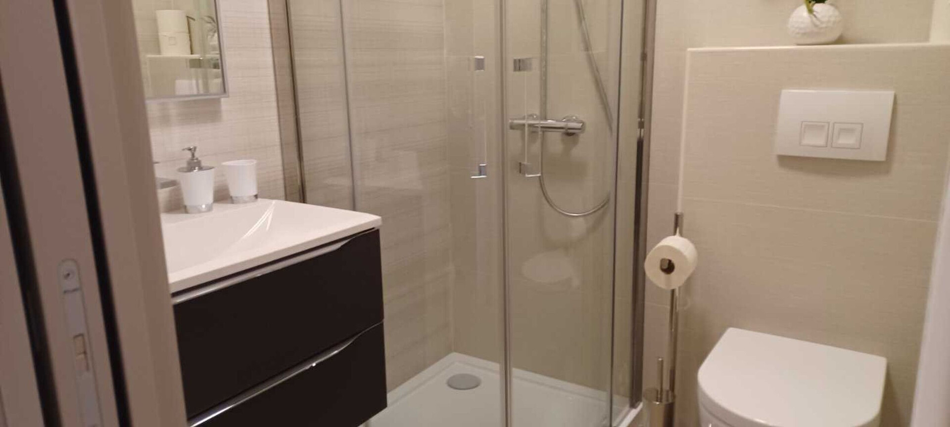 • shower, shower enclosure, hairdryer, towels.