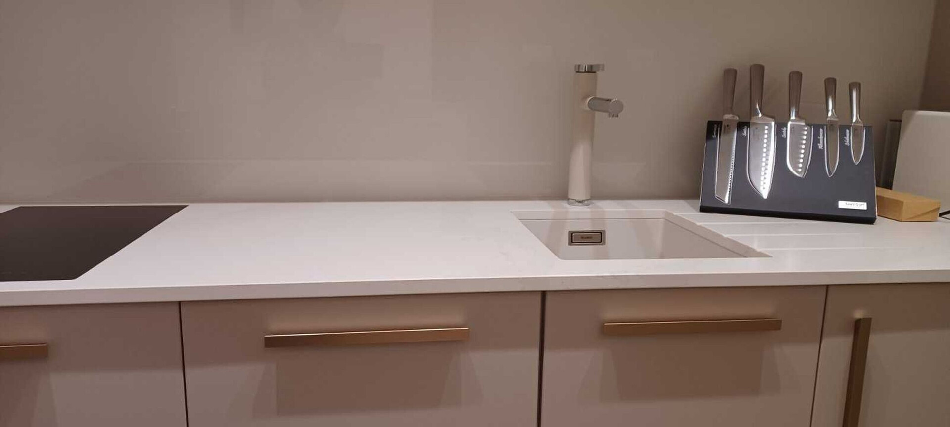 • table and chairs, kitchen sink, refrigerator, upright freezer, electric kettle, filter coffee machine, toaster, dishwasher, iron, stove cooktop.