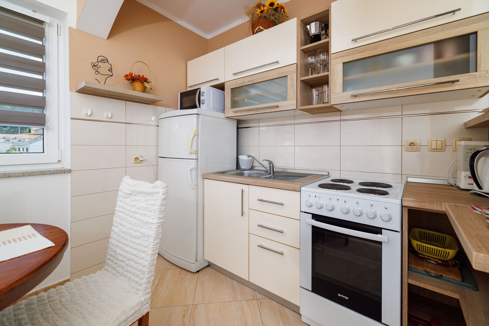• table and chairs, kitchen sink, oven, refrigerator, upright freezer, electric kettle, filter coffee machine, microwave oven, stove cooktop.