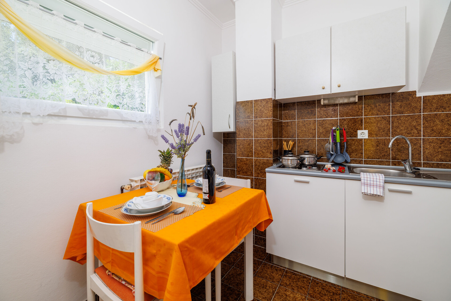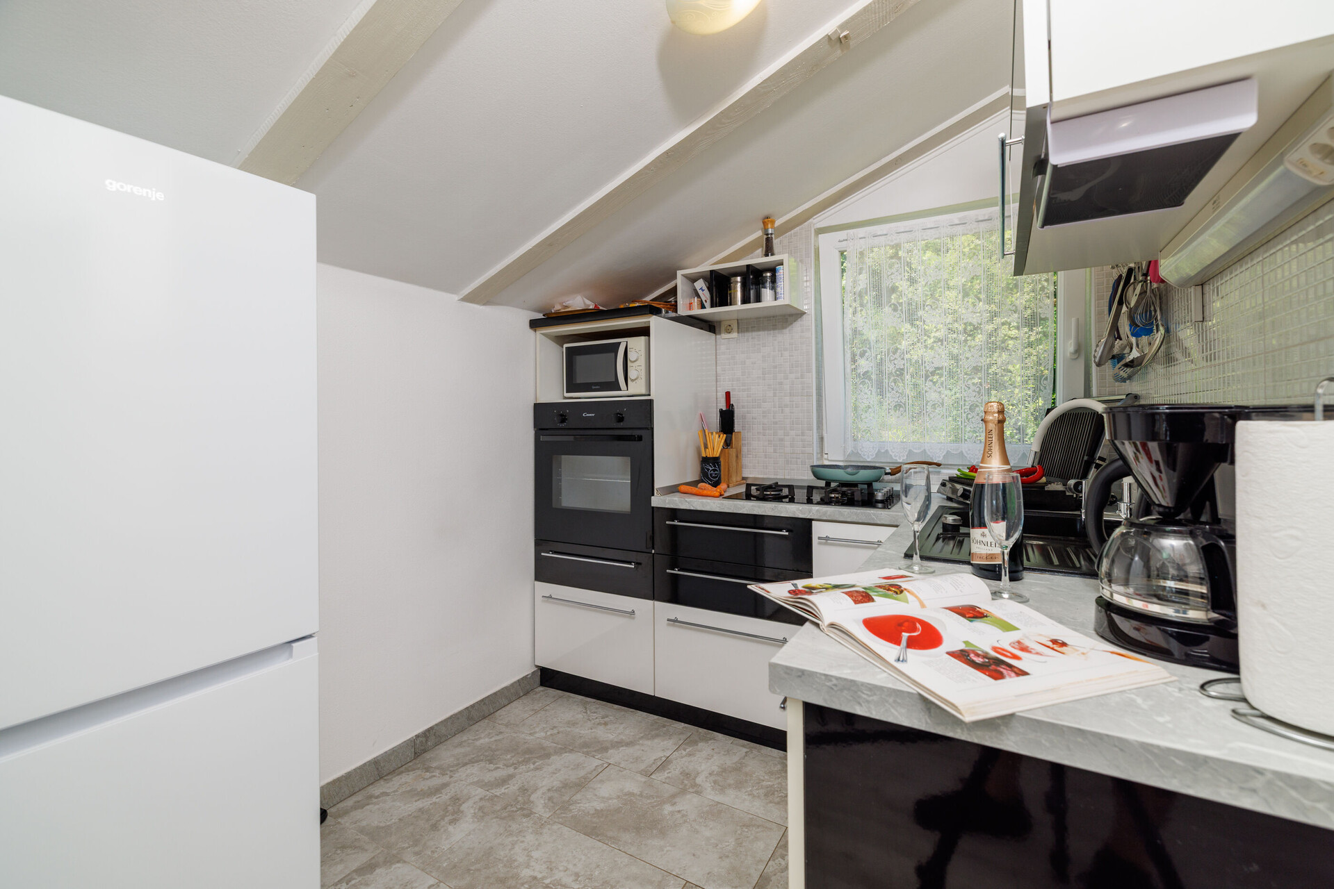 • table and chairs, kitchen sink, refrigerator, upright freezer, electric kettle, filter coffee machine, microwave oven, toaster, stove cooktop.