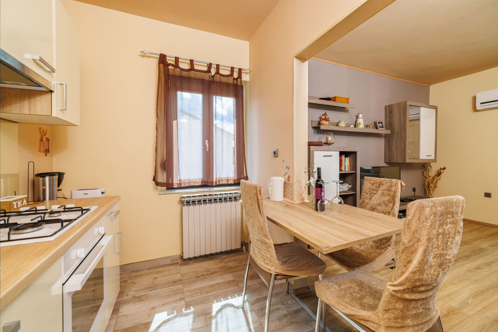 • table and chairs, kitchen sink, oven, refrigerator, upright freezer, electric kettle, filter coffee machine, toaster, stove cooktop.