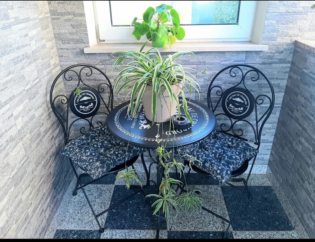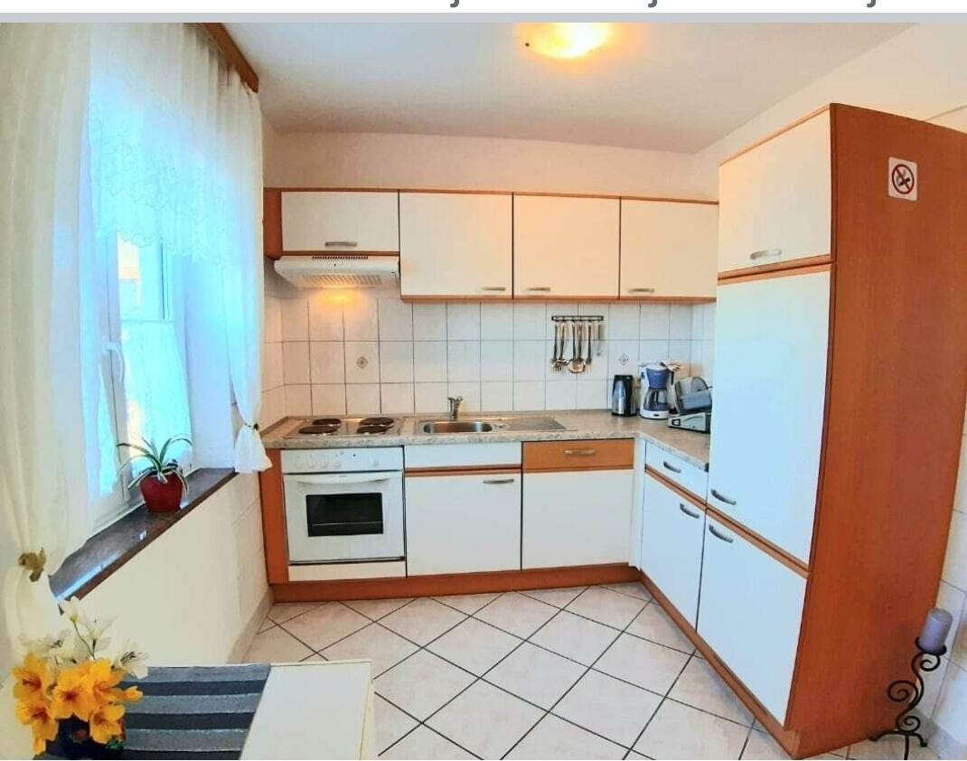 • table and chairs, kitchen sink, oven, refrigerator, upright freezer, electric kettle, filter coffee machine, microwave oven, toaster, dishwasher, iron, stove cooktop.