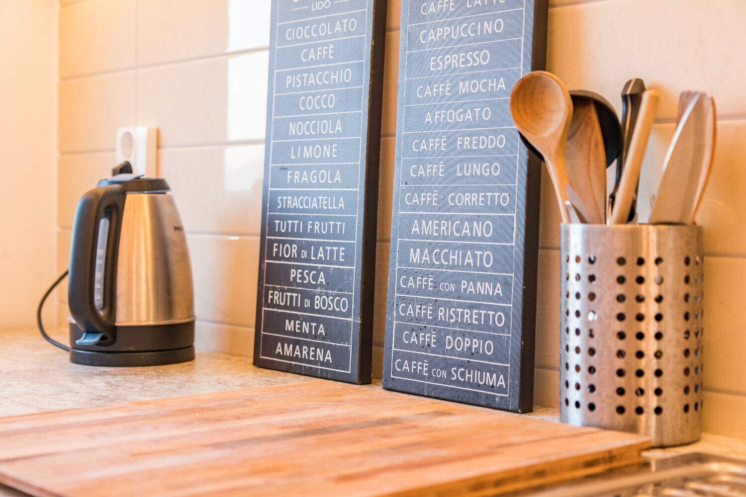 • table and chairs, kitchen sink, oven, refrigerator, upright freezer, electric kettle, microwave oven, dishwasher, stove cooktop.