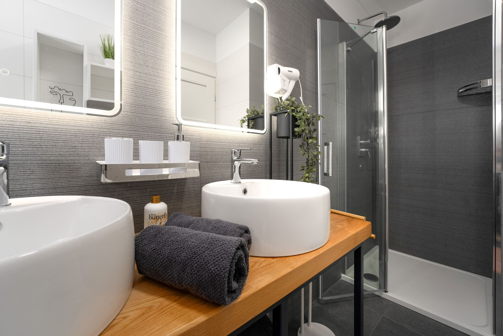 • shower, shower enclosure, washing machine, hairdryer, towels.