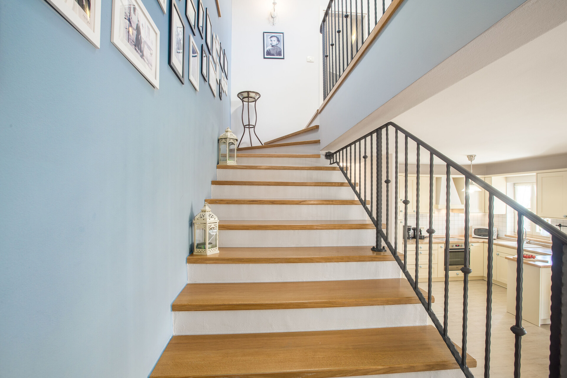 • table and chairs, kitchen sink, oven, refrigerator, upright freezer, electric kettle, filter coffee machine, microwave oven, toaster, dishwasher, iron, stove cooktop.