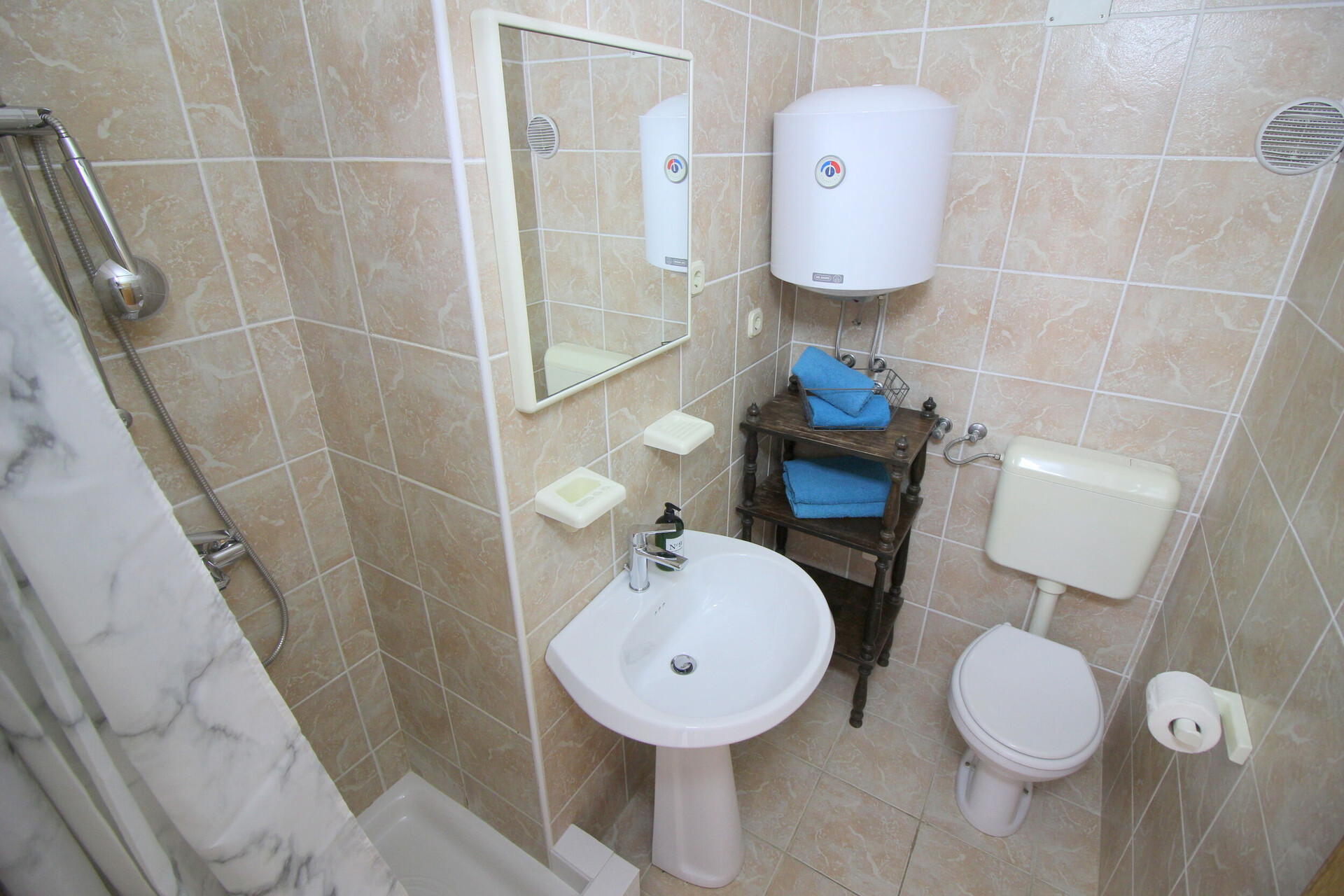 • shower, shower enclosure, hairdryer, towels.