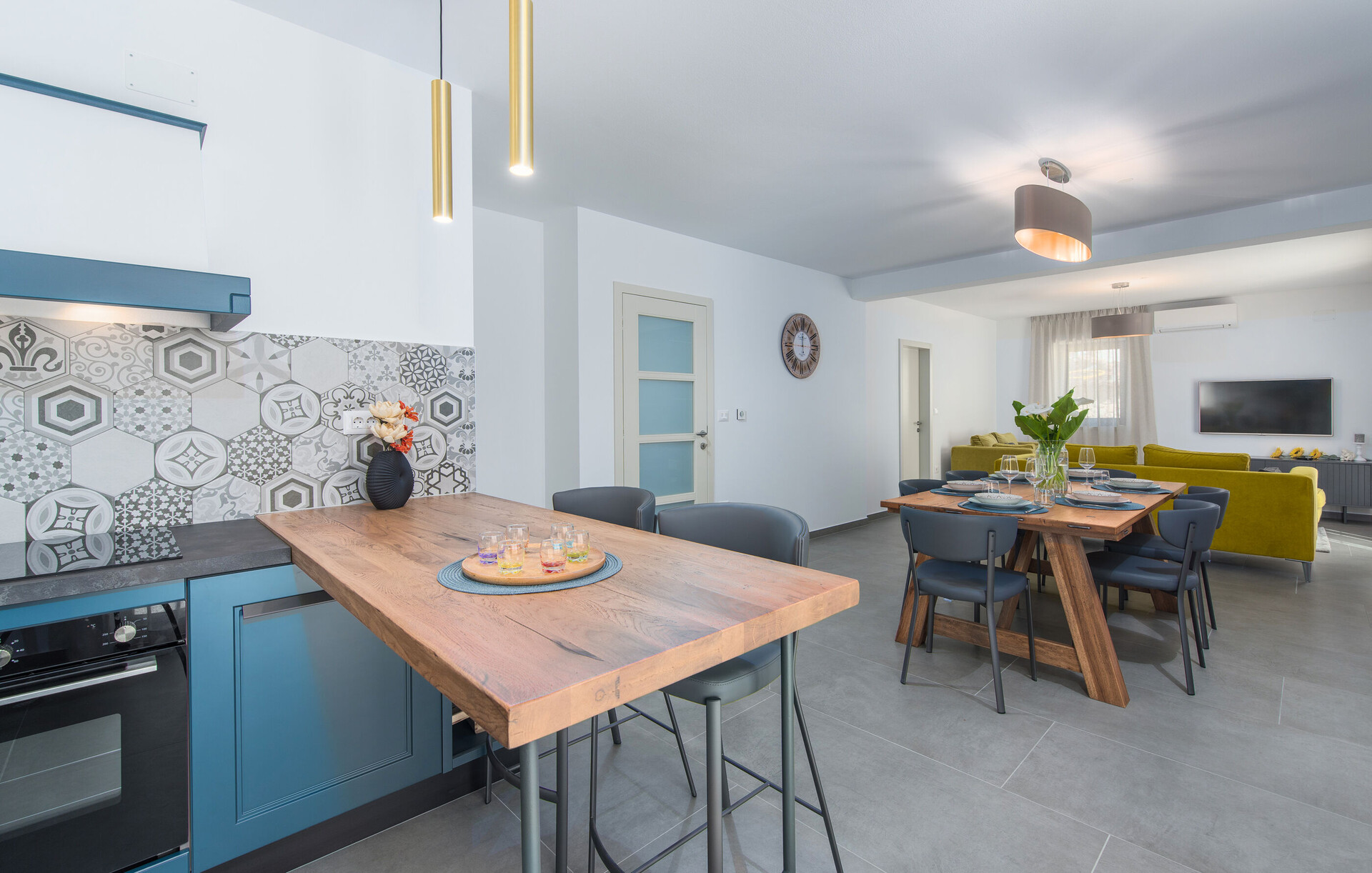 • table and chairs, kitchen sink, oven, refrigerator, upright freezer, electric kettle, filter coffee machine, toaster, dishwasher, iron, stove cooktop.