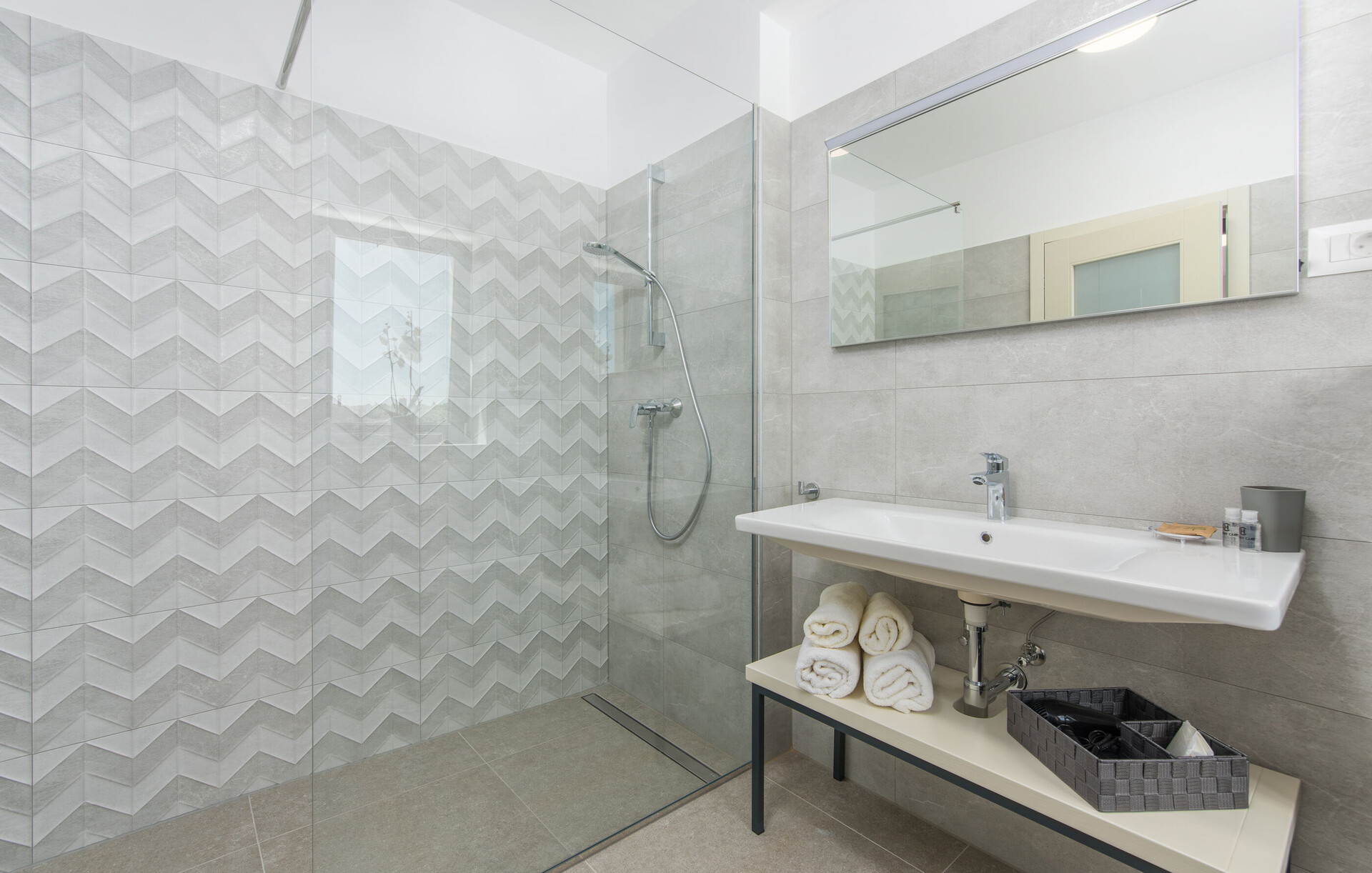 • shower, shower enclosure, washing machine, hairdryer, towels.