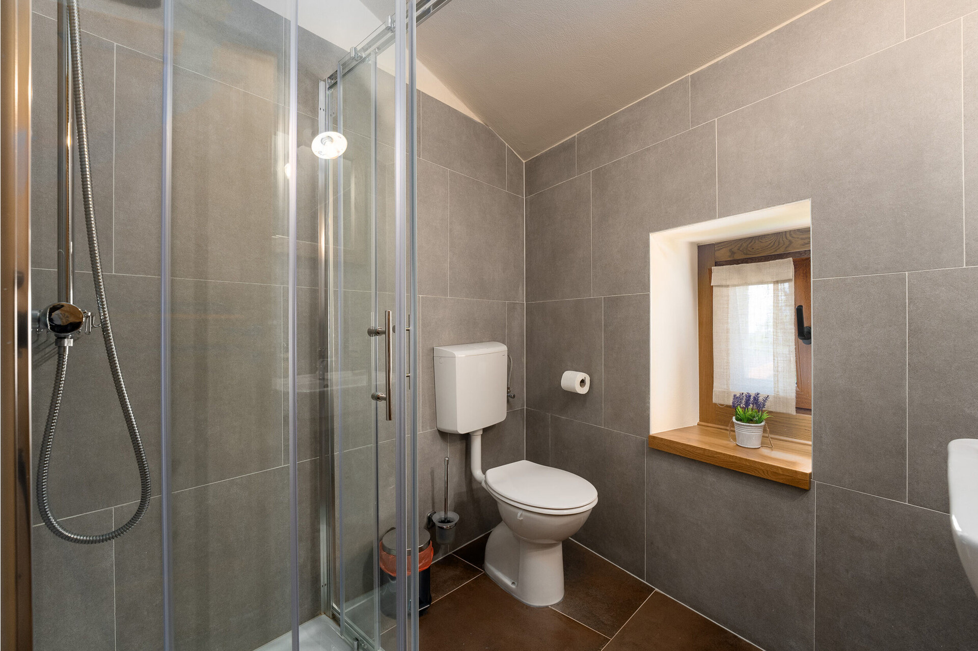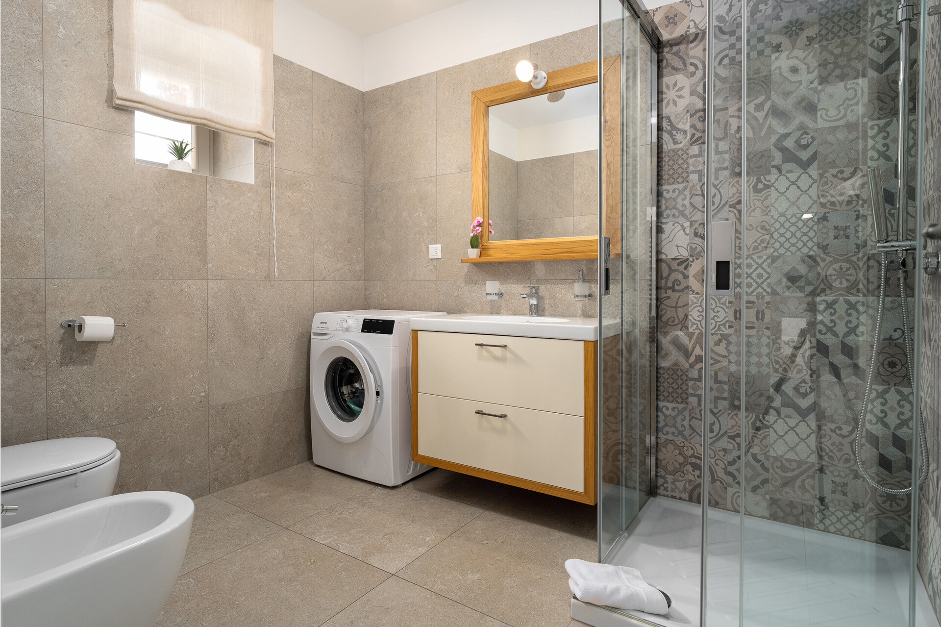 • shower, shower enclosure, washing machine, hairdryer, towels.