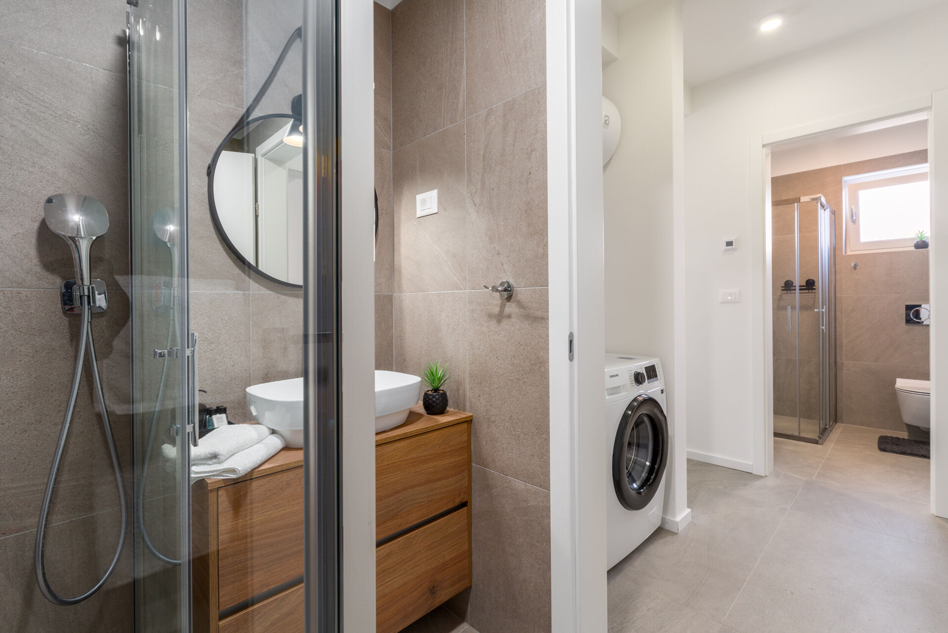 • shower, shower enclosure, washing machine, hairdryer, towels.