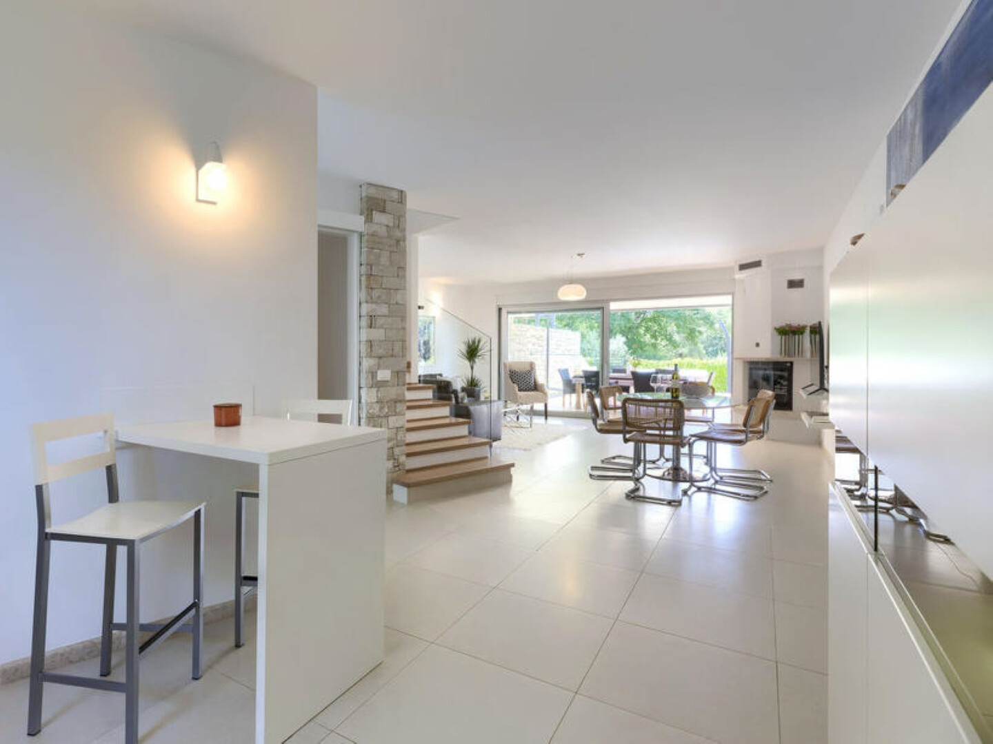 • table and chairs, kitchen sink, oven, refrigerator, upright freezer, electric kettle, filter coffee machine, microwave oven, dishwasher, stove cooktop.