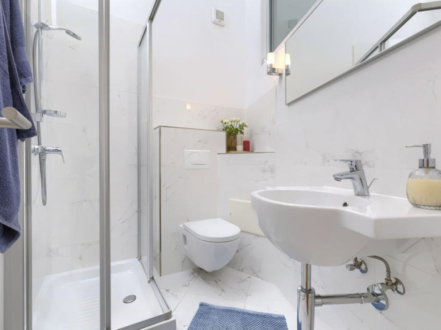 • shower, shower enclosure, towels.