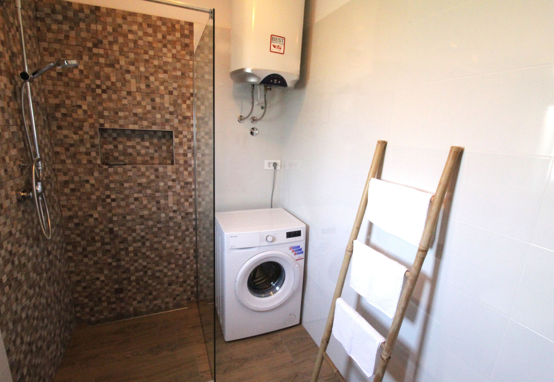 • shower, shower enclosure, washing machine, hairdryer, towels.