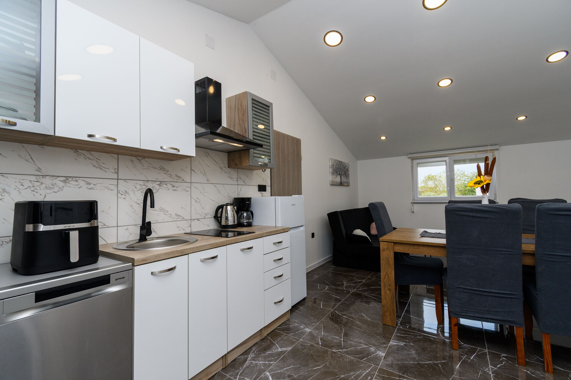 • table and chairs, kitchen sink, oven, refrigerator, upright freezer, electric kettle, filter coffee machine, microwave oven, toaster, iron, stove cooktop.