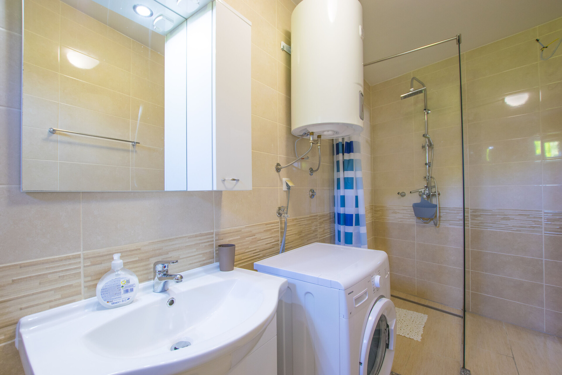 • shower, shower enclosure, towels.