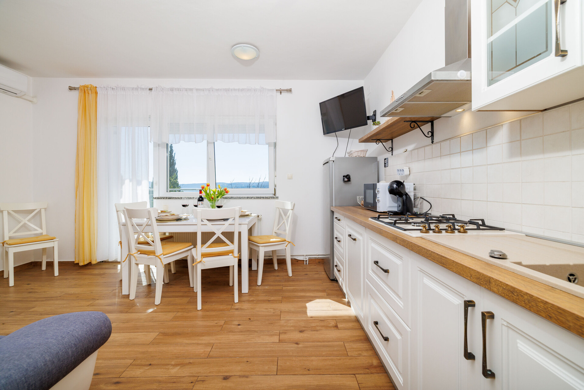 • table and chairs, kitchen sink, refrigerator, filter coffee machine, stove cooktop.