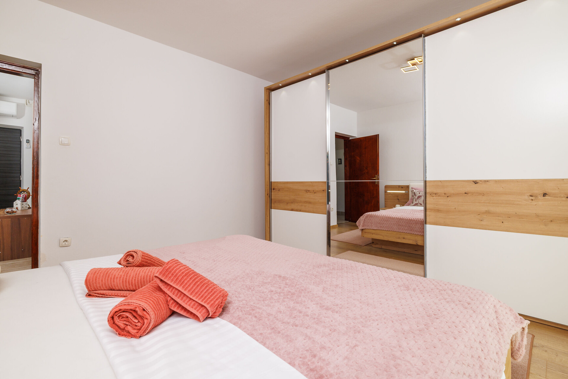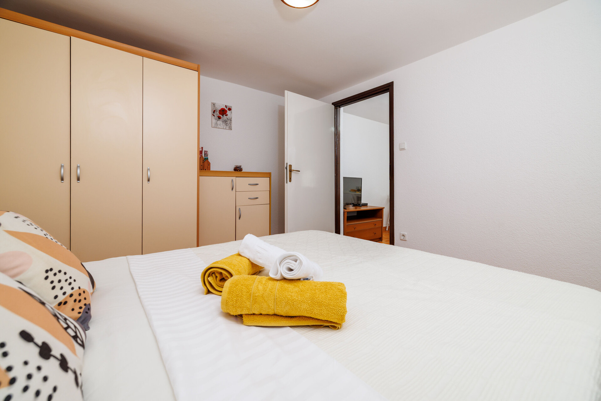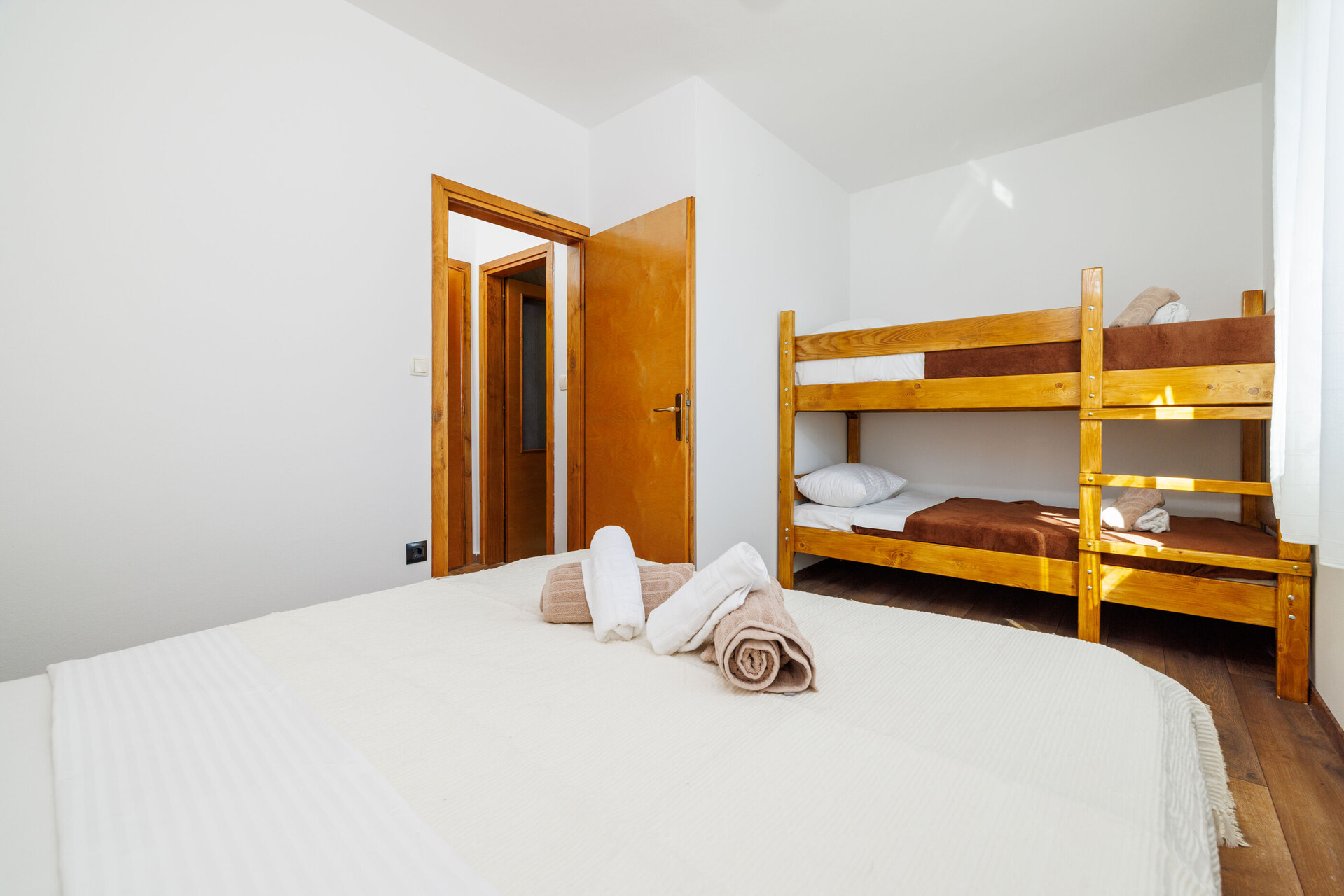 • Beds: Double bed, One bunk bed. Bedding is available. Room has an exit to the balcony.
