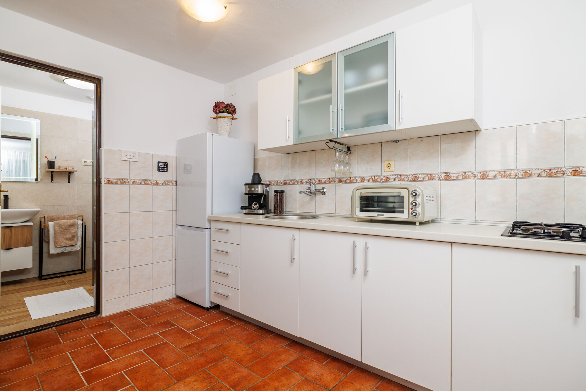 • table and chairs, kitchen sink, refrigerator, upright freezer, electric kettle, filter coffee machine, microwave oven, stove cooktop.