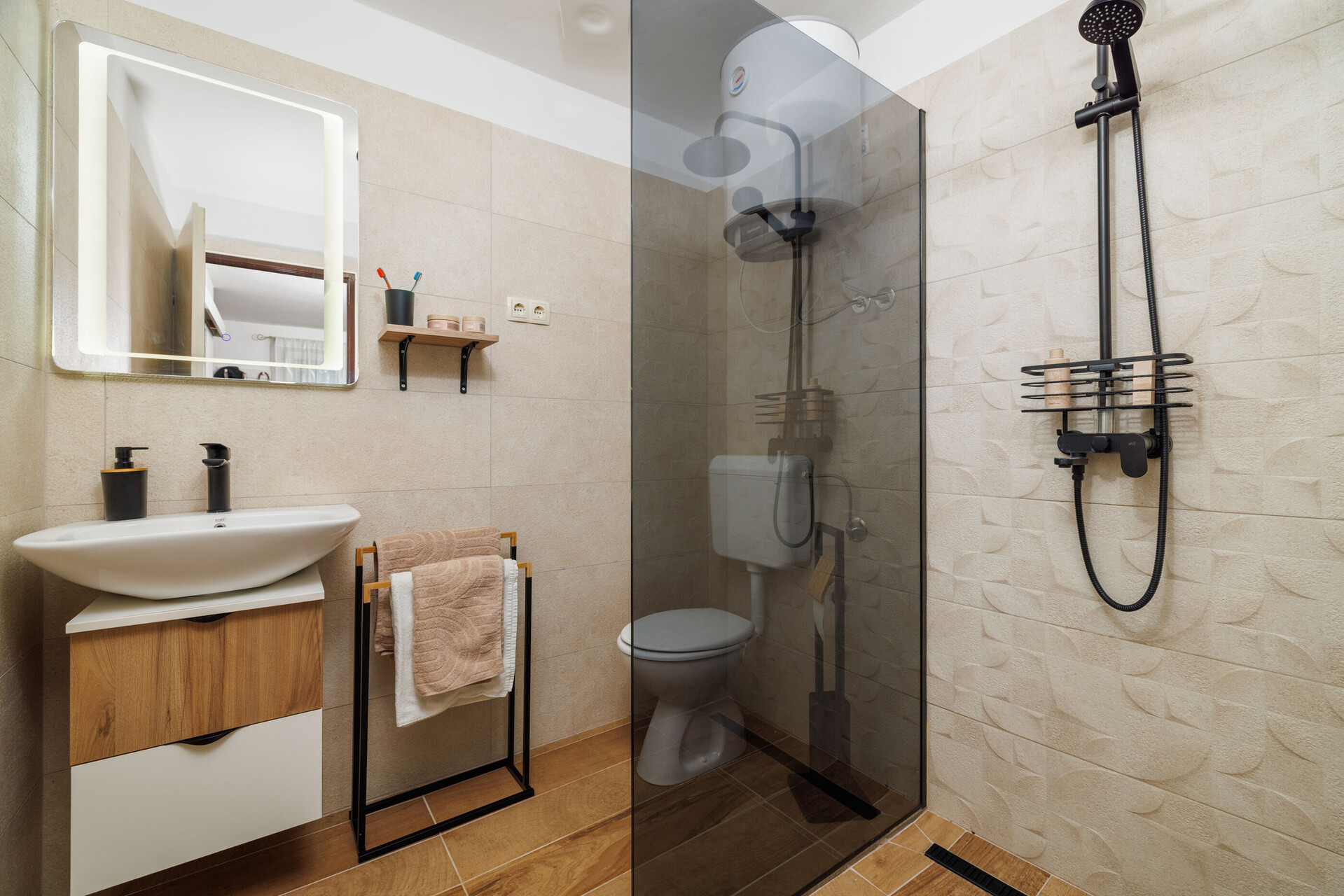 • shower, shower enclosure, hairdryer, towels.