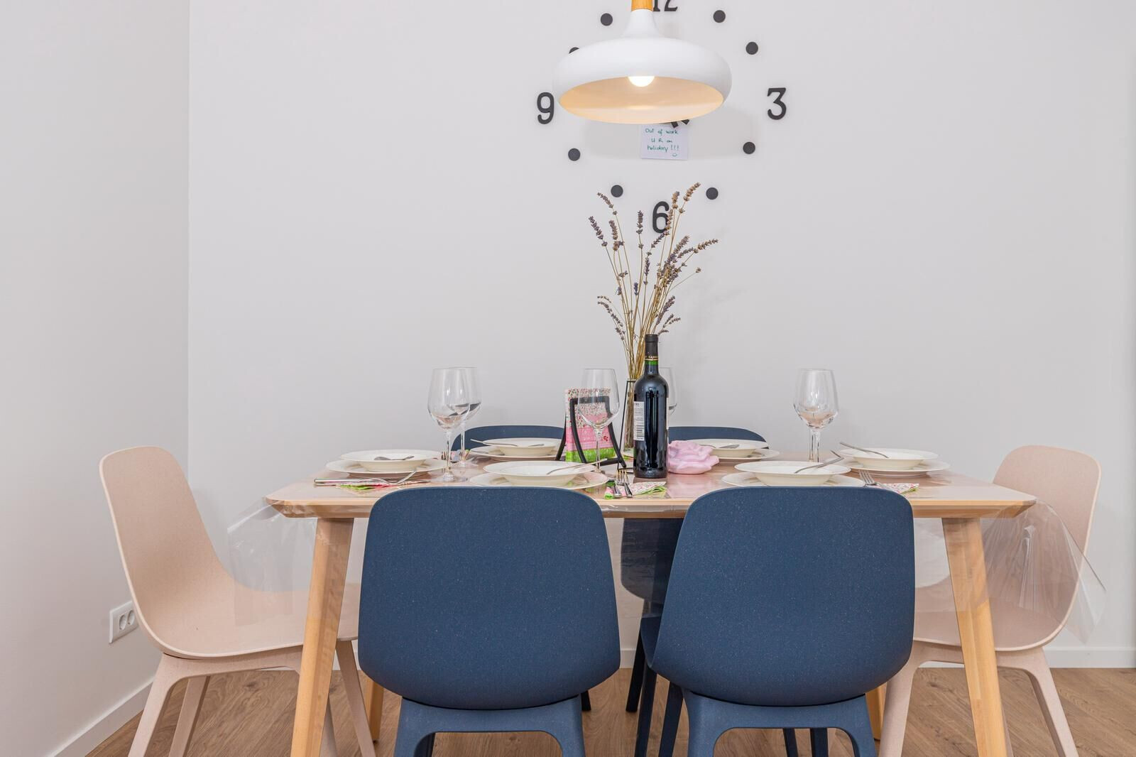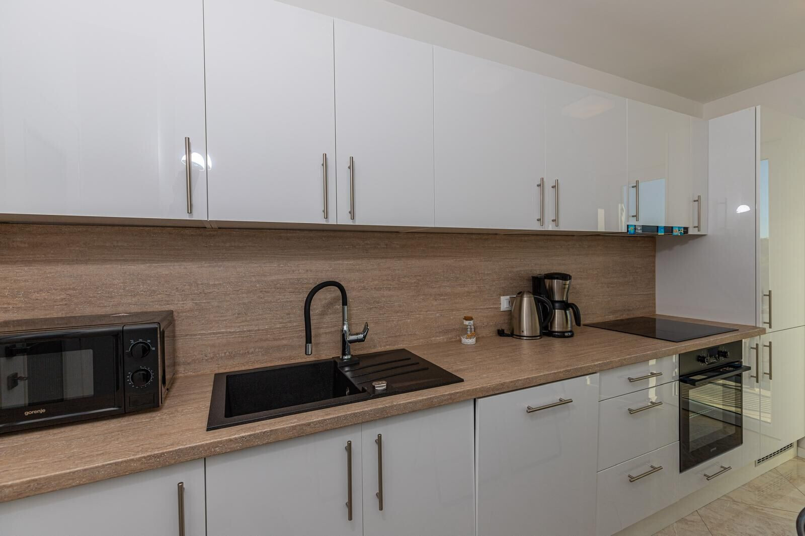 • table and chairs, kitchen sink, oven, refrigerator, upright freezer, electric kettle, filter coffee machine, toaster, dishwasher, iron, stove cooktop.