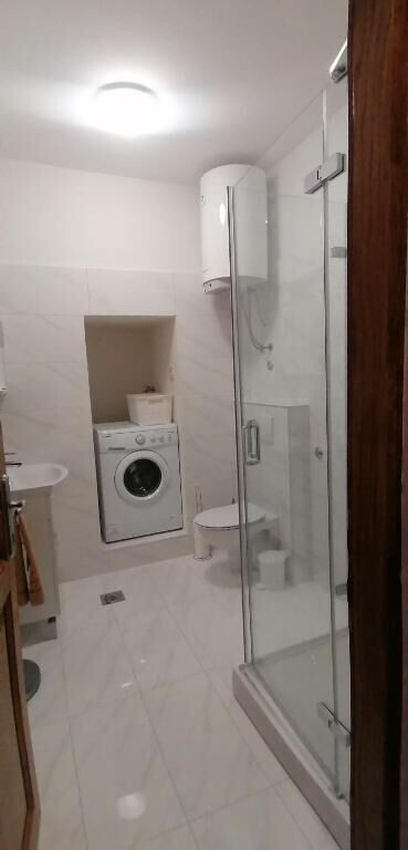 • shower, shower enclosure, washing machine, towels.