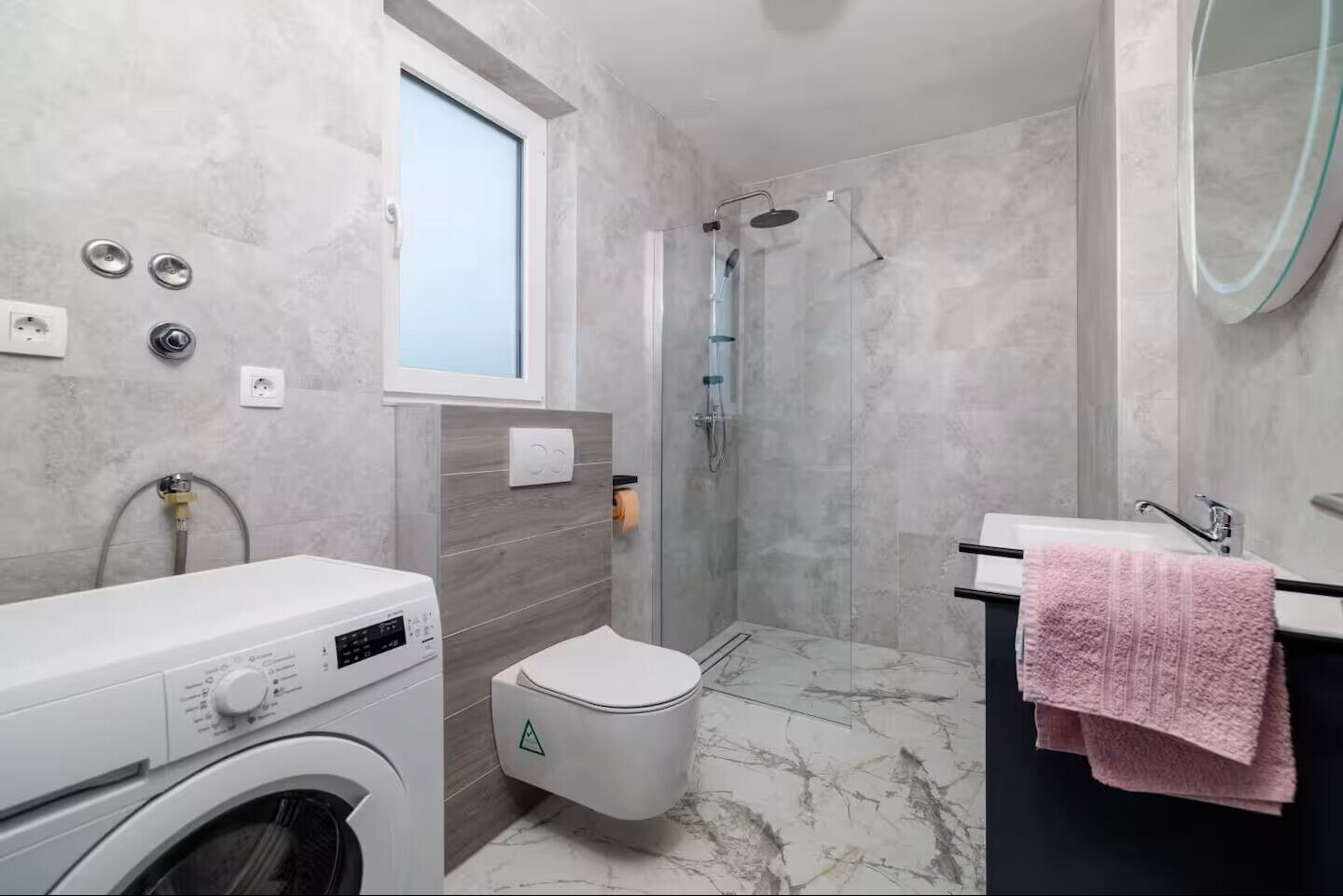 • shower, shower enclosure, washing machine, hairdryer, towels.