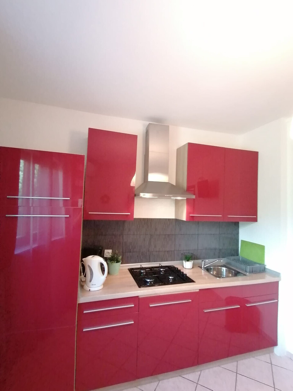 • table and chairs, kitchen sink, oven, refrigerator, upright freezer, electric kettle, filter coffee machine, microwave oven, stove cooktop.